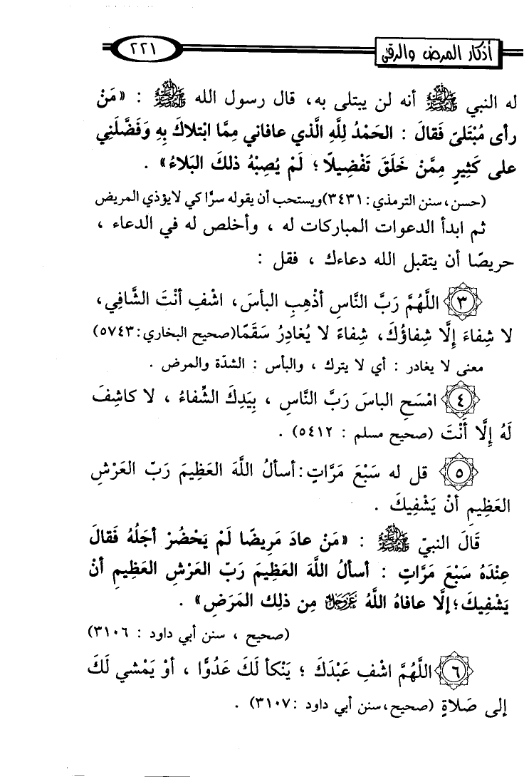 قَالَ النبيّ - صلى الله عليه وآله وسلم -: "مَنْ عادَ مَرِيضًا لَمْ يَحضُر أجَلُهُ فَقالَ عِنْدَهُ سَبْعَ مَرَّاتِ: أسالُ الله العَظِيمَ رَبّ العَرْشِ العَظِيمِ أنْ يَشْفِيكَ؛ إلا عافاهُ الله - عز وجل - ذلِك المَرَضِ".