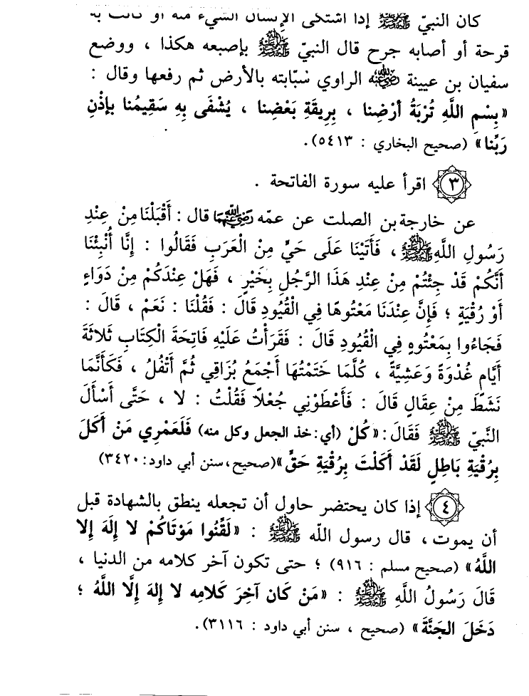 عن خارجة بن الصلت عن عمّه - رضي الله عنهما - قال: أَقْبَلْنَامِنْ عِنْدِ رَسُولِ الله - صلى الله عليه وآله وسلم -، فَأَتَيْنَا عَلَى حَى مِن الْعَرَب فَقَالُوا: إِنَا أُنْبِئْنَا أَنَّكُمْ قَذ جِئْتُمْ مِنْ عِندِ هَذَا الرّجُلِ بِخيْرٍ، فهَل عِندَكُمْ مِنْ دَوَاءٍ أَوْ رُقْيَةٍ؟ فَإِن عِنْدَنَا مَعْتُوهًا في الْقُيُودِ قَالَ: فَقُلْنَا: نَعَم، قَالَ: فَجَاءُوا بِمَعْتُوهِ في الْقُيُودِ قَالَ: فَقَرَأْتُ عَلَيهِ فَاتِحَةَ الْكِتَاب ثَلاثَةَ أَيَّام غُدْوَةً وَعَشِيةً، كُلَّمَا خَتَمْتُهَا أَجْمَعُ بُزَاقِي ثُمَّ أَتْفُلُ، فَكَأَنَّمَا نَشَطً منْ عقَالِ قَالَ: فَأَعْطَوْنِي جُعْلًا فَقُلْتُ: لا، حَتى أَسْأَلَ النَّبي - صلى الله عليه وآله وسلم - فَقَالَ: "كُلْ (أي: خذ الجعل وكل منه) فَلَعَمْرِي مَنْ أَكَلَ بِرُقْيَةِ بَاطِلٍ لَقَدْ أكلْتَ بِرُقْيَةِ حَق" (صحيح، سنن أبي داود: 3420)