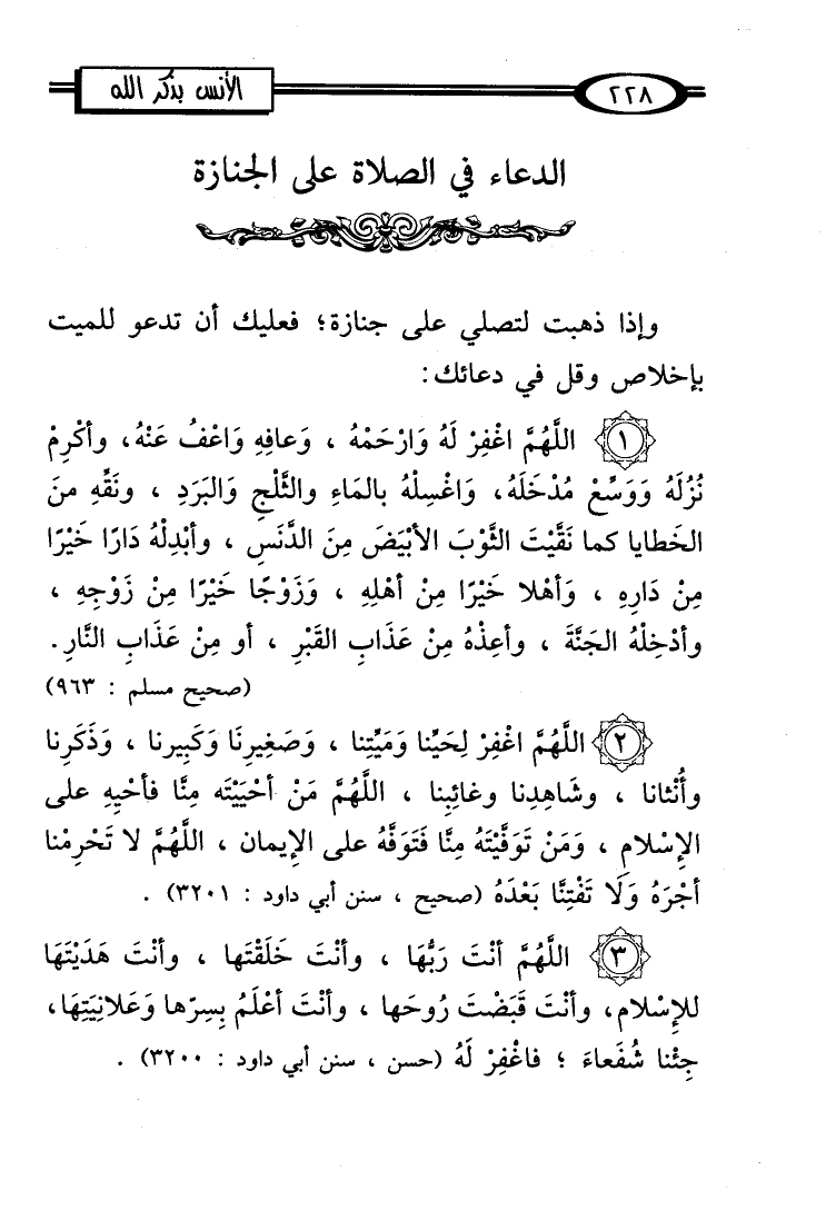 (2) اللَّهُمَّ اغْفِز لِحَيِّنا وَمَيِّتِنا، وَصَغِيرِنَا وَكَبِيرنا، وَذَكَرِنا وأُنْثانا، وشَاهِدِنا وغائِبنا، اللَّهُمَّ مَنْ أحْيَيْتَه منا فأحْيِهِ على الإِسْلام، وَمَنْ تَوَفيْتَهُ منا فَتَوَفَّهُ على الإِيمان، اللَّهُمَّ لا تَحْرِمْنا أجْرَهُ وَلَا تَفْتِنَّا بَعْدَهُ (صحيح، سنن أبي داود: 3201).