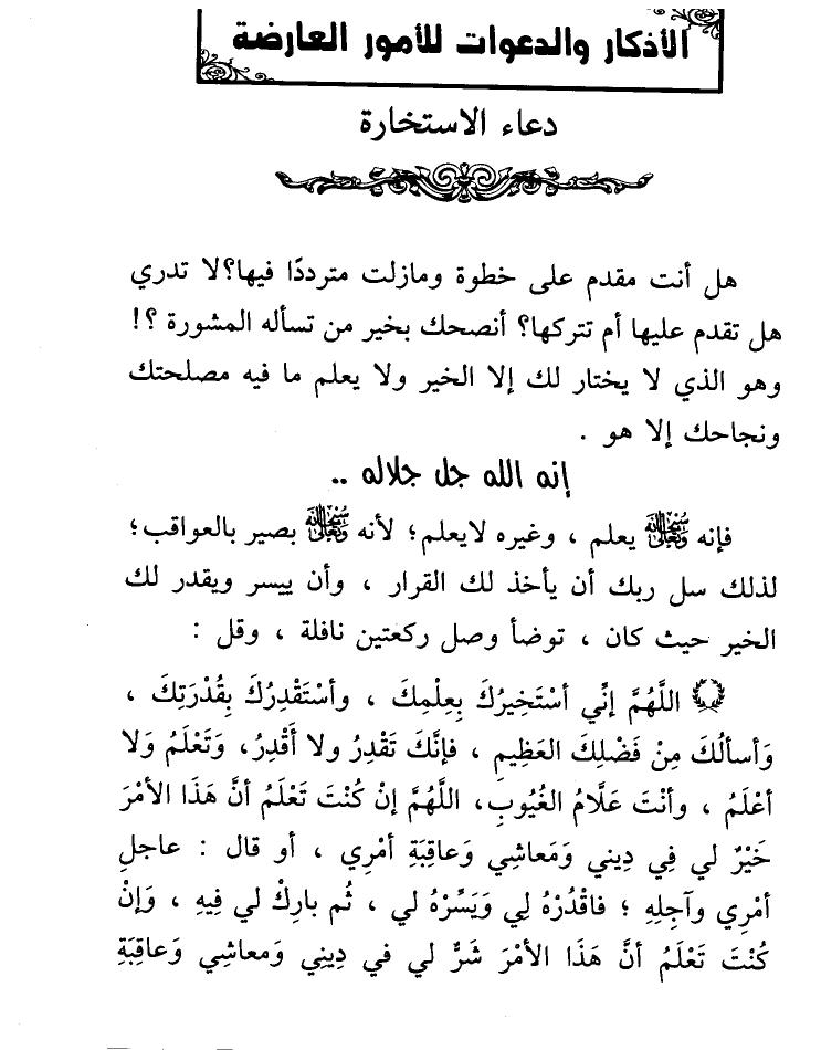 اللهم إنِّي أسْتَخِيرُكَ بِعِلْمِكَ، وأسْتَقْدِرُكَ بِقُدْرَتِكَ، وَأسألُكَ مِنْ فَضْلِكَ العَظِيمِ، فإنَّكَ تَقْدِرُ ولا أَقْدِرُ، وَتَعْلَمُ وَلا أعْلَمُ، وأنْتَ عَلَّامُ الغُيُوبِ، اللَّهُمَّ إنْ كُنْتَ تَعْلَمُ أنَّ هَذَا الأمْرَ خير لي في دِيني وَمَعاشِي وَعاقِبَةِ أمْرِي، أو قال: عاجلِ أمْرِي وآجِلِهِ؛ فاقْدُرْهُ بي وَيسِّرْهُ لي، ثُم بارِكْ لي فِيهِ، وإنْ كُنْتَ تَعْلَمُ أنَّ هَذَا الأمْرَ شَرُّ لي في دِينِي وَمعاشِي وَعاقِبَةِ