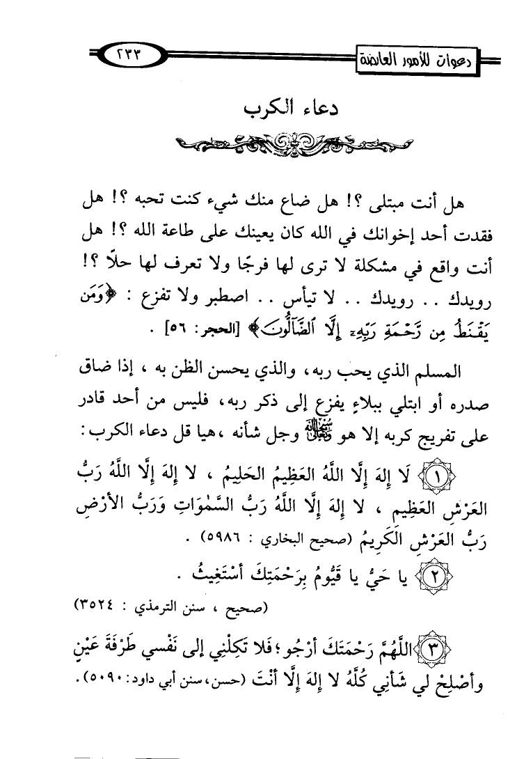 (1) لَا إِلهَ إِلَّا الله العَظِيمُ الحَليمُ، لا إِلهَ إِلَّا الله رَبُّ العَرْشِ العَظِيمِ، لا إِلهَ إِلَأ الله رَبّ السَّموَاتِ ورب الأرْضِ رَبُّ العَرْش الكَرِيمُ (صحيح البخاري: 5986).