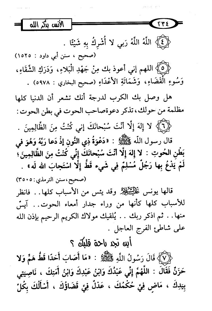 (7) قَالَ رَسُولُ الله - صلى الله عليه وسلم -:" مَا أَصَابَ أَحَدًا قَطُّ هَمِّ وَلا حَزَنٌ فَقَالَ: اللَّهُمَّ إِنِّي عَبْدُكَ وَابْنُ عَبْدِكَ وَابْنُ أَمَتِكَ، نَاصِيَتِي بِيَدِكَ، مَاضٍ فِيَّ حُكْمُكَ، عَدْلٌ فِيَّ قَضَاؤُكَ، أَسْاَلُكَ بِكُلِّ