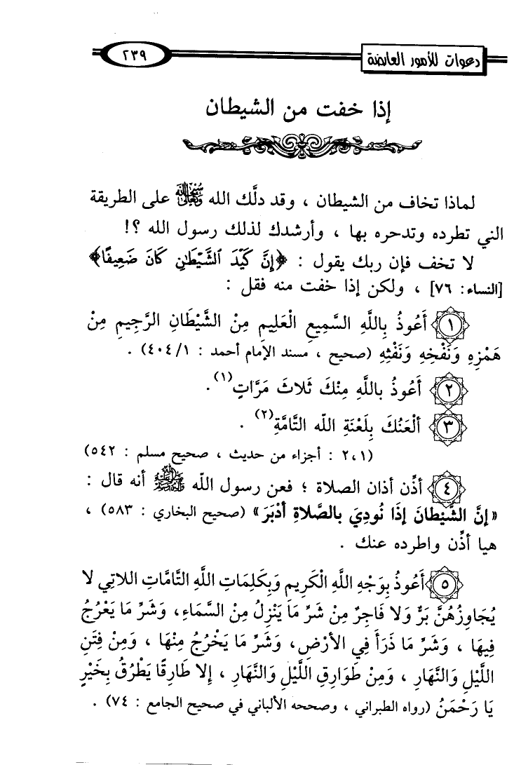 لماذا تخاف من الشيطان، وقد دلَّك الله - سبحانه وتعالى - على الطريقة التي تطرده وتدحره بها، وأرشدك لذلك رسول الله؟! لا تخف فإن ربك يقول: {إِنَّ كَيْدَ الشَّيْطَانِ كَانَ ضَعِيفًا} [النساء: 76]، ولكن إذا خفت منه فقل:
