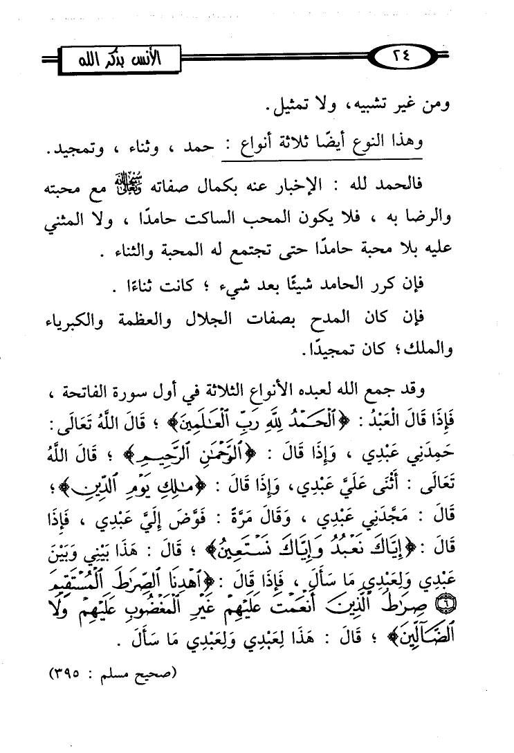 وقد جمع الله لعبده الأنواع الثلاثة في أول سورة الفاتحة، فَإِذَا قَالَ العَبْدُ: {الْحَمْدُ لِلَّهِ رَبِّ الْعَالَمِينَ}: قَالَ الله تَعَالَى: حَمِدَنِي عَبْدِي، وإِذَا قَالَ: {الرَّحْمَنِ الرَّحِيمِ}؛ قَالَ الله تَعَالَى: أَثنَى عَلَيَّ عَبْدِي، وإذا قَالَ: {مَالِكِ يَوْمِ الدِّينِ}؛ قَالَ: مَجَّدَنِيِ عَبْدِي، وَقَالَ مَرَّةً: فَوَّضَ إِلَيَّ عَبْدِي، فَإِذَا قَالَ: {إِيَّاكَ نَعْبُدُ وَإِيَّاكَ نَسْتَعِينُ}، قَالَ: هَذَا بَينِي وَبَيْنَ عَبدِي وِلِعبدي مَا سَأَلَ، فَإذَا قَالَ: {اهْدِنَا الصِّرَاطَ الْمُسْتَقِيمَ (6) صِرَاطَ الَّذِينَ أَنْعَمْتَ عَلَيْهِمْ غَيْرِ الْمَغْضُوبِ عَلَيْهِمْ وَلَا الضَّالِّينَ}؛ قَالَ: هَذَا لِعَبْدِي وَلِعَبْدِي مَا سَأَلَ.