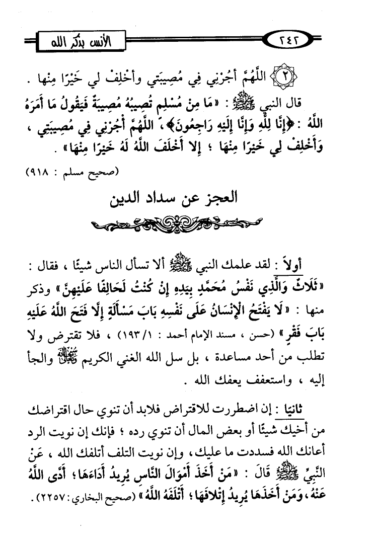 قال النبي - صلى الله عليه وسلم -: "مَا مِنْ مُسْلِم تُصِيبُهُ مُصِيبَةٌ فَيَقُولُ مَا أَمَرَهُ الله: {إِنَّا لِلَّهِ وَإِنَّا إِلَيْهِ رَاجِعُونَ}، اللهُم أْجُرْنِي في مُصِيبَتِي، وَأَخْلِفْ لِي خَيرًا مِنْهَا؛ إِلا أَخْلَفَ الله لَهُ خَيرَا مِنْهَا".