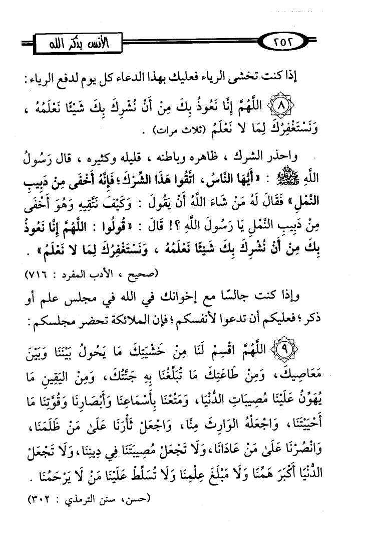 (8) اللَّهُمَّ إِنَّا نَعُوذُ بِكَ مِنْ أنْ نُشْرِكَ بِكَ شَيْئًا نَغلَمُهُ، وَنَسْتَغْفِرُكَ لِمَا لا نَعْلَمُ (ثلاث مرات).