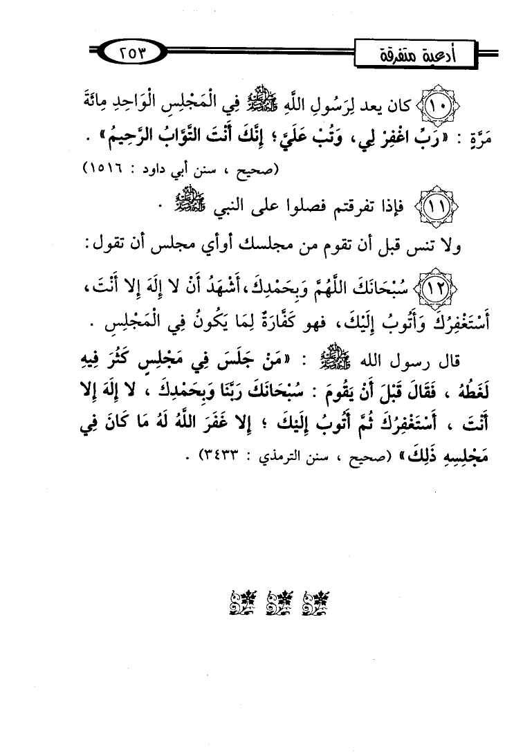 (12) سُبحَانَكَ اللهُم وَبِحَمْدِكَ، أَشْهَدُ أَنْ لا إِلَهَ إِلا أَنْتَ، أَسْتَغْفِرُك وَأتُوبُ إِلَيْكَ، فهو كَفَّارَة لِمَا يَكُونُ فِي الْمَجْلِسِ.