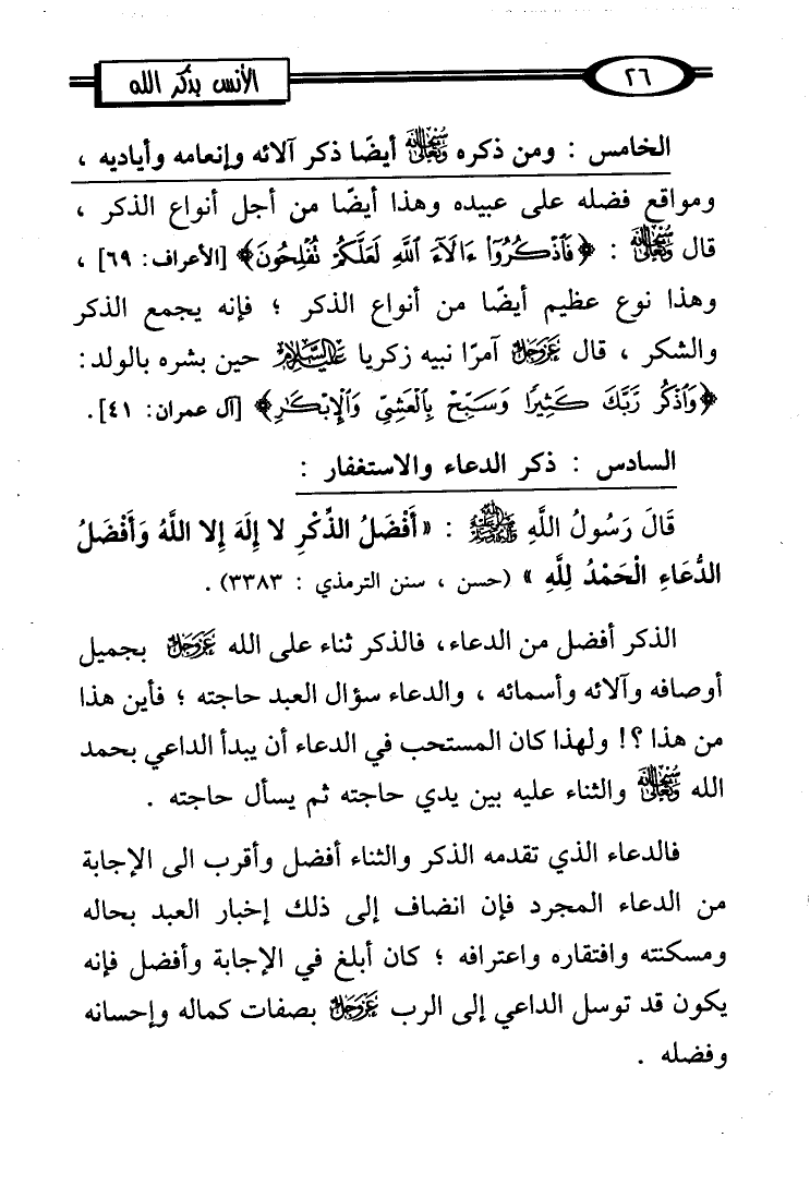 السادس: ذكر الدعاء والاستغفار: قَالَ رَسُولُ الله - صلى الله عليه وسلم -: "أَفْضَلُ الذكْرِ لا إِلَهَ إِلا الله وَأَفْضَلُ الدعَاءِ الحَمْدُ لله" (حسن، سنن الترمذي: 3383).
