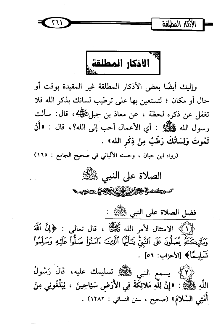 وإليك أيضًا بعض الأذكار المطلقة غير المقيدة بوقت أو حال أو مكان، لتستعين بها على ترطيب لسانك بذكر الله فلا تغفل عن ذكره لحظة، عن معاذ بن جبل - رضي الله عنه - قال: سألت رسول الله - صلى الله عليه وسلم -: أي الأعمال أحب إلى الله؟، قال: "أَنْ تَمُوتَ وَلسَانُكَ رَطْبٌ مِنْ ذِكْرِ الله".