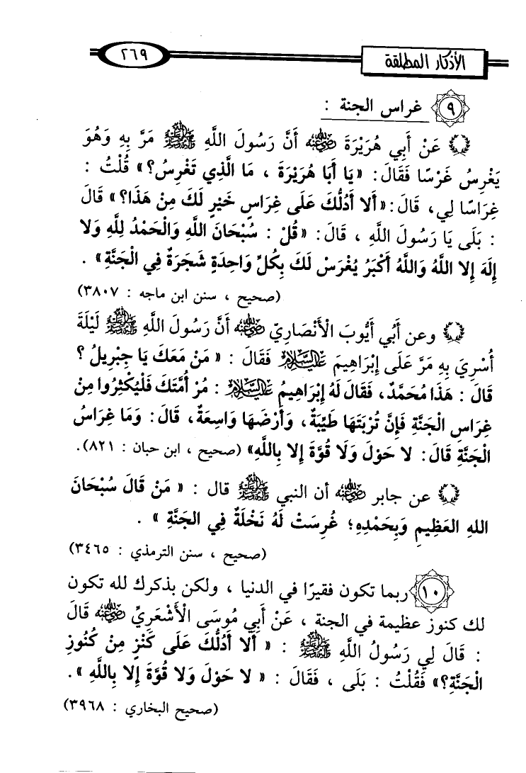 عَنْ أَبِي هُرَيْرَةَ - رضي الله عنه - أَنَّ رَسُولَ اللهِ - صلى الله عليه وسلم - مَر بِهِ وَهُوَ يَغْرِسُ غَرسًا فَقَالَ: "يَا أبا هُرَيرَةَ، مَا الذِي تَغْرِسُ؟ " قُلْتُ: غِرَاسَا لي، قَالَ: "أَلا أَدلكَ عَلَى غِرَاسٍ خَيرٍ لَكَ مِنْ هَذَا؟ قَالَ: بَلَى يَا رَسُولَ اللهِ، قَالَ: "قُلْ: سُبْحَانَ اللهِ وَالْحَمْدُ لله وَلا إِلَهَ إِلا الله وَاللهُ أكبَرُ يُغْرَس لَكَ بِكُل وَاحِدةٍ شَجَرَةٌ في الْجَنّةِ".