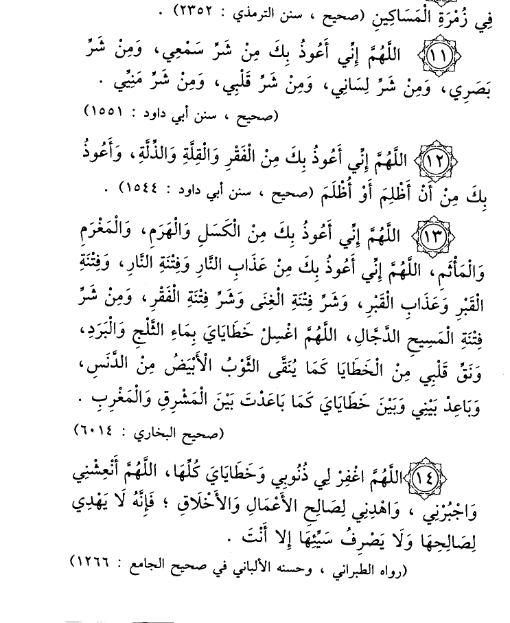 (13) اللهُمَّ إِني أَعُوذُ بِكَ مِنْ الْكَسَلِ وَالْهَرَمِ، وَالْمَغْرَمِ وَالْمَأْثَمِ، اللهُم إِني أَعُوذُ بِكَ مِنْ عَذَابِ النَّارِ وَفِتْنَةِ النَّارِ، وَفِتْنَةِ الْقَبْرِ وَعَذَابِ الْقَبْرِ، وَشَرِّ فِتْنَةِ الغِنَى وَشَرِّ فِتْنَةِ الْفَقْرِ، وَمِنْ شَرِّ فِتْنَةِ الْمَسِيحِ الدجَّالِ، اللهُم اغْسِلْ خَطَايَايَ بِمَاءِ الثلْجِ وَالْبَرَدِ، وَنَق قَلْبِي مِنْ الْخَطَايَا كَمَا يُنَفى الثَوْبُ الْأَبْيَضُ مِنْ الدَّنَسِ، وَبَاعِدْ بَيْنِي وَبَيْنَ خَطَايَايَ كَمَا بَاعَدْتَ بَيْنَ الْمَشْرِقِ وَالْمَغْرِبِ.