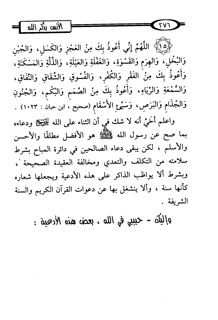 (15) اللَّهُم إِني أَعُوذُ بِكَ من العَجزِ وَالكَسَلِ، وَالجُبنِ وَالبُخلِ، وَالهِرَمِ وَالقَسوَةِ، وَالغَفلَةِ وَالعَيْلَةِ، وَالذِّلةِ وَالمسكَنَةِ، وَأَعُوذُ بِكَ من الفَقْرِ وَالكُفْرِ، وَالفُسُوقِ وَالشقَاقِ وَالنفَاقِ، وَالسُّمْعَةِ وَالرِّيَاءِ، وَأَعُوذُ بِكَ من الصَّمَمِ وَالبُكْمِ، وَالجُنُونِ وَالجُذَامِ وَالبَرَصِ، وَسَيئِ الأَسقَامِ (صحيح، ابن حبان: 1023).