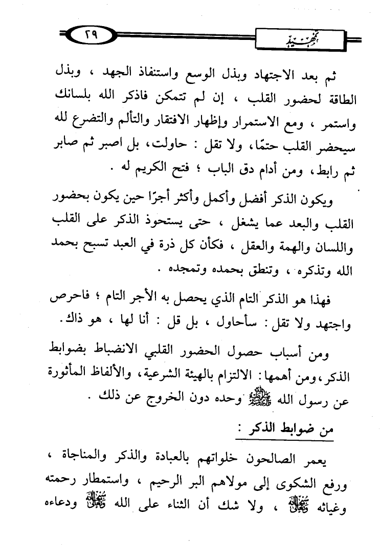 ثم بعد الاجتهاد وبذل الوسع واستنفاذ الجهد، وبذل الطاقة لحضور القلب، إن لم تتمكن فاذكر الله بلسانك واستمر، ومع الاستمرار وإظهار الافتقار والتألم والتضرع لله سيحضر القلب حتمًا، ولا تقل: حاولت، بل اصبر ثم صابر ثم رابط، ومن أدام دق الباب، فتح الكريم له.