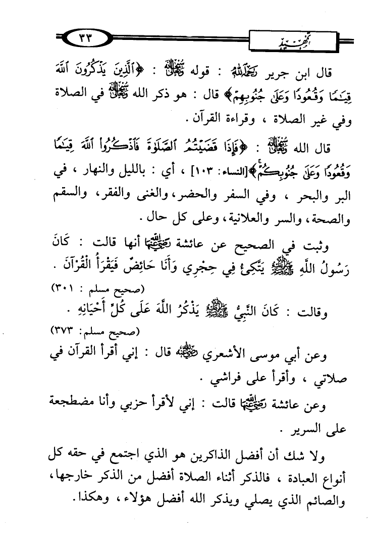 قال ابن جرير - رحمه الله -: قوله - سبحانه وتعالى -: {الَّذِينَ يَذْكُرُونَ اللَّهَ قِيَامًا وَقُعُودًا وَعَلَى جُنُوبِهِمْ} قال: هو ذكر الله - سبحانه وتعالى - في الصلاة وفي غير الصلاة، وقراءة القرآن.