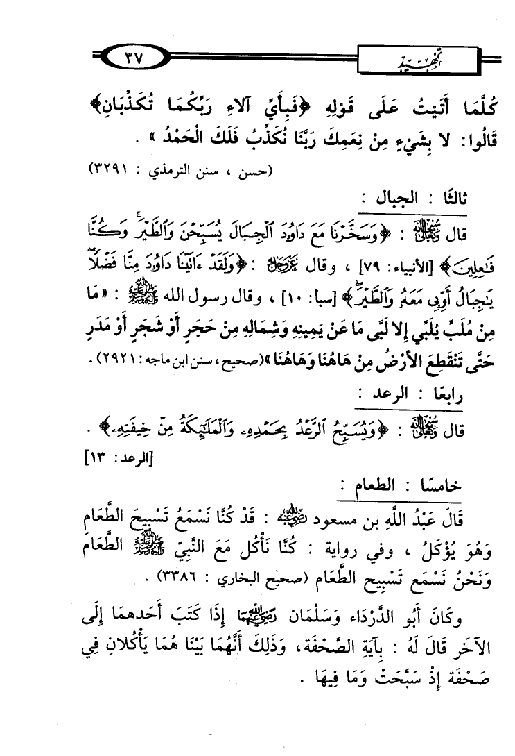قَالَ عَبْدُ اللهِ بن مسعود - رضي الله عنه -: قَدْ كُنَّا نَسْمَعُ تَسْبيح الطَّعَام وَهُوَ يُؤْكَلُ، وفي رواية: كُنَّا نَأْكُل مَعَ النبِي - صلى الله عليه وسلم - الطَّعَامَ وَنَحنُ نَسْمَع تَسْبِيح الطَّعَام (صحيح البخاري: 3386).