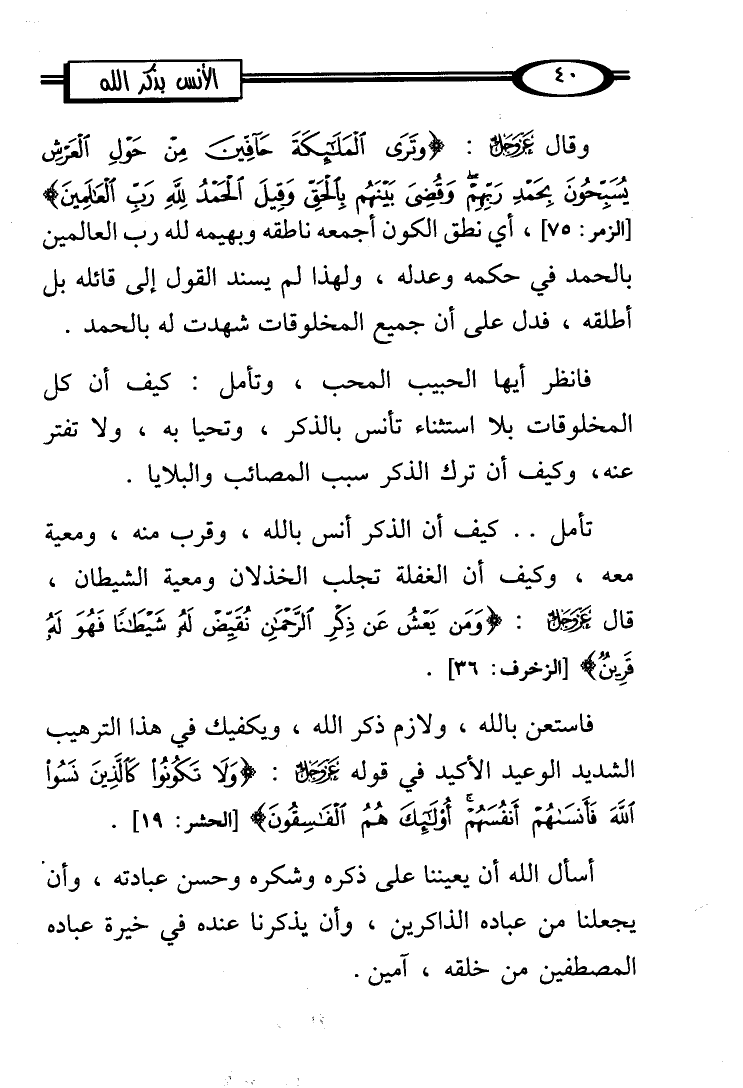فانظر أيها الحبيب المحب، وتأمل: كيف أن كل المخلوقات بلا استثناء تأنس بالذكر، وتحيا به، ولا تفتر