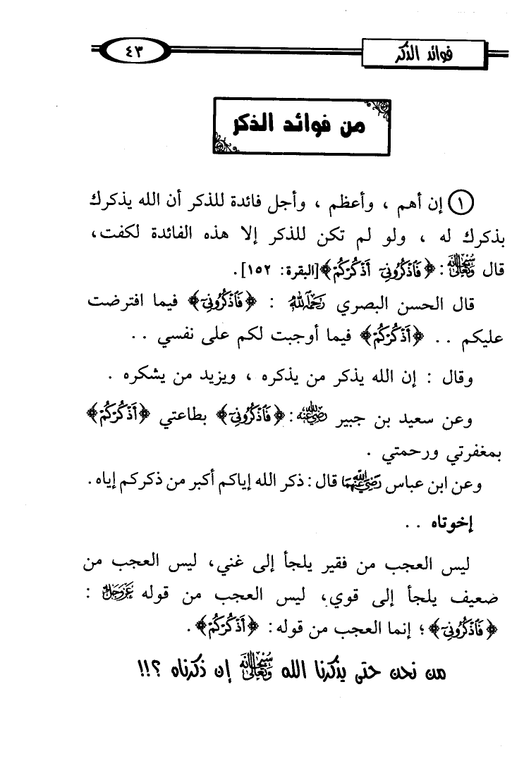 (1) إن أهم، وأعظم، وأجل فائلة للذكر أن الله يذكرك بذكرك له، ولو لم تكن للذكر إلا هذه الفائدة لكفت، قال - سبحانه وتعالى -: {فَاذْكُرُونِي أَذْكُرْكُمْ} [البقرة: 152].