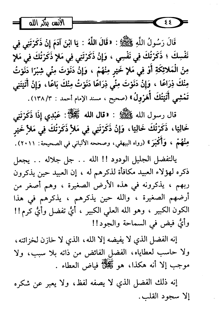 قَالَ رَسُولُ اللهِ - صلى الله عليه وسلم -: (قَالَ الله: يَا ابْنَ آدَمَ إِنْ ذَكَرْتَنِي في نَفْسِكَ؛ ذَكَرْتُكَ في نَفْسِي، وَإِن ذَكَرْتَنِي في مَلإ ذَكَرْتُكَ في مَلإ مِنْ الْمَلاِئكَةِ أَوْ في مَلإ خَيرٍ مِنْهُمْ، وَإِنْ دَنَوْتَ مِنِّي شِبْرًا دنَوْتُ مِنْكَ ذِرَاعًا، وَإِنْ دَنَوْتَ مِنِّي ذِرَاعًا دَنَوْتُ مِنْكَ بَاعًا، وَإِنْ أَتَيتَنِي تَمْشِي أَتَيتُكَ أُهَرْوِلُ" (صحيح، مسند الإِمام أحمد: 3/ 138).