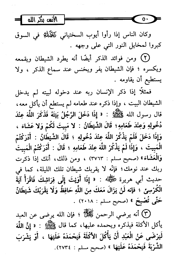 دُخُولِهِ وَعِنْدَ طَعَامِهِ، قَالَ الشيطَانُ: لا مَبِيتَ لَكُمْ وَلا عَشَاءَ، وَإِذَا دَخَلَ فَلَمْ يَذْكرْ اللهَ عِنْدَ دُخُولِهِ؛ قَالَ الشيطَانُ: أَدْرَكْتُمْ الْمَبيتَ، وَإِذَا لَمْ يَذْكُرْ الله عِنْدَ طَعَامِهِ؛ قَالَ: أَدْرَكْتُمْ الْمَبِيتَ وَالْعًشَاءَ" (صحيح مسلم: 3763)، ومن ذلك، أنك إذا ذكرت ربك عند نومك؛ فإنّه لا يقربك شيطان تلك الليلة، كما في حيث أبي هريرة - رضي الله عنه -: إِذا أَوَيْتَ إِلَى فِرَاشِكَ فَاقْرَأْ آيَةَ الْكُرْسِي؛ فإنه لَنْ يَزَالَ مَعَكَ مِنَ اللهِ حَافِظٌ وَلَا يَقْرَبُكَ شَيطَانّ حَتى تُصْبِحَ" (صحيح مسلم:2018).