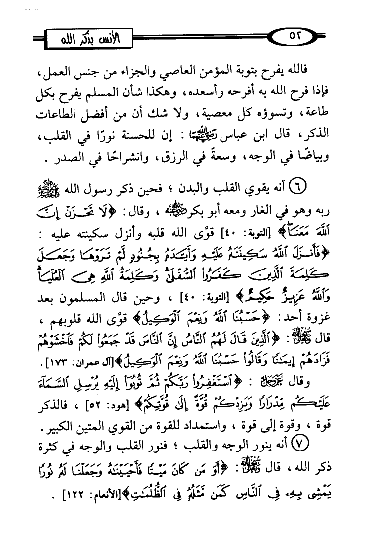 (6) أنه يقوي القلب والبدن ة فحين ذكر رسول الله - صلى الله عليه وسلم - ربه وهو في الغار ومعه أبو بكر - رضي الله عنه -، وقال: {لَا تَحْزَنْ إِنَّ اللَّهَ مَعَنَا} [التوبة: 40] قوى الله قلبه وأنزل سكينته عليه: {فَأَنْزَلَ اللَّهُ سَكِينَتَهُ عَلَيْهِ وَأَيَّدَهُ بِجُنُودٍ لَمْ تَرَوْهَا وَجَعَلَ كَلِمَةَ الَّذِينَ كَفَرُوا السُّفْلَى وَكَلِمَةُ اللَّهِ هِيَ الْعُلْيَا وَاللَّهُ عَزِيزٌ حَكِيمٌ} [التوبة: 40]، وحين قال المسلمون بعد غزوة أحد: {حَسْبُنَا اللَّهُ وَنِعْمَ الْوَكِيلُ} قوى الله قلوبهم، قال - سبحانه وتعالى -: {النَّاسُ إِنَّ النَّاسَ قَدْ جَمَعُوا لَكُمْ فَاخْشَوْهُمْ فَزَادَهُمْ إِيمَانًا وَقَالُوا حَسْبُنَا اللَّهُ وَنِعْمَ الْوَكِيلُ} [آل عمران: 173]