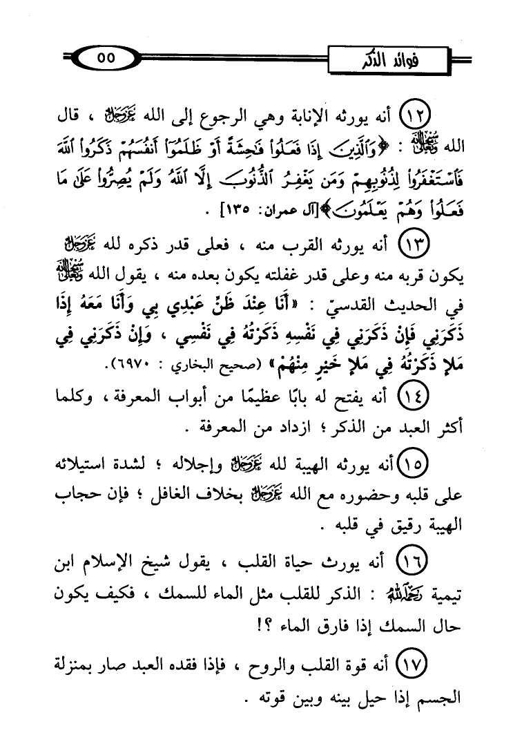 (16) أنه يورث حياة القلب، يقول شيخ الإِسلام ابن تيمية - رحمه الله -: الذكر للقلب مثل الماء للسمك، فكيف يكون حال السمك إذا فارق الماء؟!