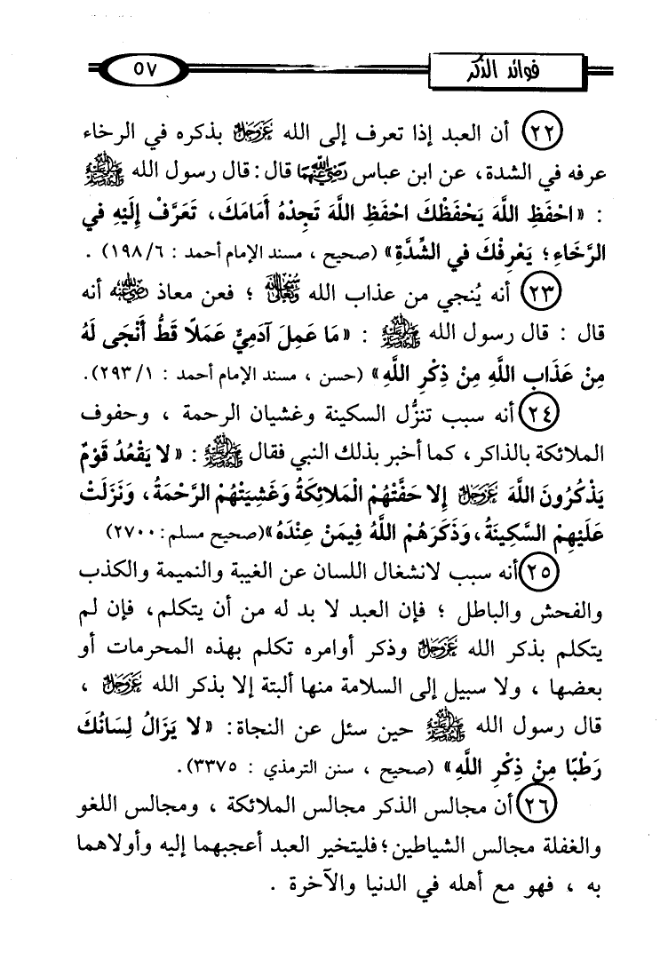 (22) أن العبد إذا تعرف إلى الله - عز وجل - بذكره في الرخاء عرفه في الشدة، عن ابن عباس - رضي الله عنهما - قال: قال رسول الله - صلى الله عليه وسلم -: "احْفَظِ الله يَحْفَظْكَ احْفَظِ الله تَجِدْهُ أَمَامَكَ، تَعَرّفْ إِلَيهِ في الرَّخَاءِ؛ يَعْرِفْكَ في الشدةِ" (صحيح، مسند الإِمام أحمد: 198/ 6).