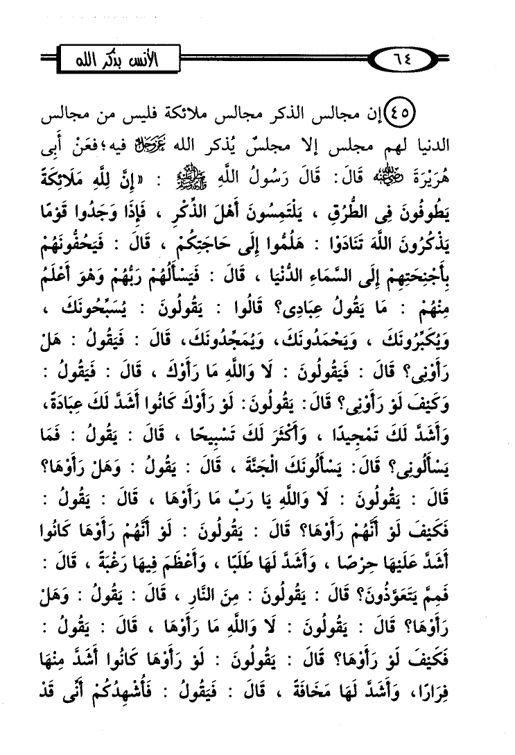 (45) إن مجالس الذكر مجالس ملائكة فليس من مجالس الدنيا لهم مجلس إلا مجلس يُذكر الله - عز وجل - فيه؛ فعن أَبِي هُرَيْرَةَ - رضي الله عنه - قَالَ: قَالَ رَسُولُ اللهِ - صلى الله عليه وسلم -: "إِن لِلَّهِ مَلَاِئكَةً يَطُوفُونَ في الطُرُقِ، يَلْتَمِسُونَ هْلَ الذكْرِ، فَإِذَا وَجَمُوا قَوْمًا يَذْكُرُونَ اللهَ تَنَادوْا: هَلُمُّوا إِلَى حَاجَتِكُمْ، قَالَ: فَيَحُفُونَهُم بِأجنِحَتِهِمْ إِلَى السِّمَاءِ الدُنيَا، قَالَ: فَيَسْألُهُمْ رَبهُم وَهْوَ أَعْلَمُ مِنْهُمْ: مَا يَقُولُ عِبَادِى؟ قَالُوا: يَقُولُونَ: يُسَبحُونَكَ، وَيكبرُونَكَ، وَيَحمُدونَكَ، وَيُمجَّدُونَكَ، قَالَ: فَيَقُولُ: هَلْ رَأَوْني؟ قَالَ: فَيَقُولُونَ: لَا وَالله مَا رَأَوْكَ، قَالَ: فَيَقُولُ: وَكَيفَ لَوْ رَأَؤنِى؟ قَالَ: يَقُولُونَ: لَوْ رَأَوْكَ كَانُوا أَشَدَّ لَكَ عِبَادة، وَأَشَدَّ لَكَ تَمْجيدا، وَأكَثَرَ لَكَ تَسْبِيحَا، قَالَ: يَقُولُ: فَمَا يَسْألُوني؟ قَال: يَسْاَلُونَكَ الْجَنَّةَ، قَالَ: يَقُولُ: وَهَلْ رَأَوْهَا؟ قَالَ: يَقُولُونَ: لَا وَالله يَارَبَّ مَا رَأَوْهَا، قَالَ: يَقُولُ: فَكَيفَ لَوْ أنهُمْ رَأَوْهَا؟ قَالَ: يَقُولُونَ: لَوْ؟ نهُمْ رَأَوْهَا كَانُوا أَشَدَّ عَلَيهَا حِرْصّا، وَأَشَدَّ لَهَا طَلَبًا، وَأَعْظَمَ فِيهَا رَغْبَةً، قَالَ: