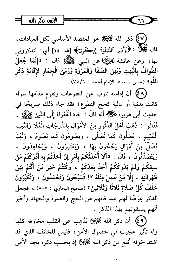 (47) ذكر الله - عز وجل - هو المقصود الأساسي لكل العبادت, قال - سبحانه الله وتعالى - {وَأَقِمِ الصَّلَاةَ لِذِكْرِي} [طه: 14] أي: لتذكروني بها، وعن عائشة - رضي الله عنهما - عن النبي - صلى الله عليه وسلم -: قال:" إِنَّمَا جُعِلَ الطوَافُ بِالْبَيتِ وَبَينَ الصَّفَا وَالْمَرْوَةِ وَرَمْىُ الجْمَارِ لإِقَامَةِ ذِكرِ اللهِ" (حسن، مسند الإِمام أحمد: 6/ 75).