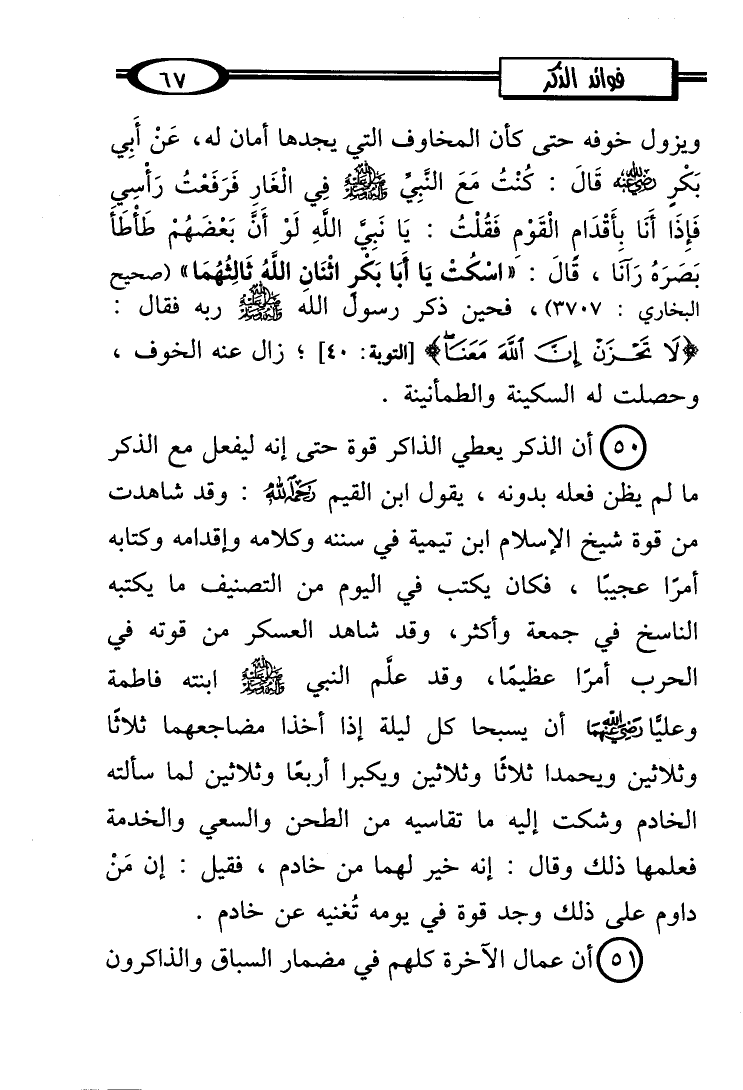 (50) أن الذكر يعطي الذاكر قوة حتى إنه ليفعل مع الذكر ما لم يظن فعله بدونه، يقول ابن القيم في - رحمه الله -: وقد شاهدت من قوة شيخ الإِسلام ابن تيمية في سننه وكلامه وإقدامه وكتابه أمراً عجيبًا، فكان يكتب في اليوم من التصنيف ما يكتبه الناسخ في جمعة وأكثر، وقد شاهد العسكر من قوته في الحرب أمراً عظيما، وقد علَّم النبي - صلى الله عليه وسلم - ابنته فاطمة وعليَّار - رضي الله عنهما - أن يسبحا كل ليلة إذا أخذا مضاجعهما ثلاثًا وثلاثين ويحمدا ثلاثًا وثلاثين ويكبرا أربعَا وثلاثين لما سألته الخادم وشكت إليه ما تقاسيه من الطحن والسعي والخدمة فعلمها ذلك وقال: إنه خير لهما من خادم، فقيل: إن مَنْ داوم على ذلك وجد قوة في يومه تُغنيه عن خادم.