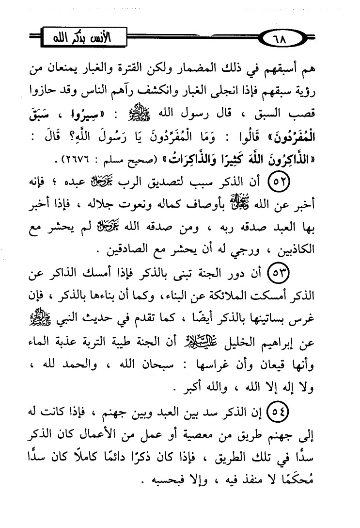 (53) أن دور الجنة تبنى بالذكر فإذا أمسك الذاكر عن الذكر أمسكت الملائكة عن البناء، وكما أن بناءها بالذكر، فإن غرس بساتينها بالذكر أيضًا، كما تقدم في حديث النبي - صلى الله عليه وسلم -