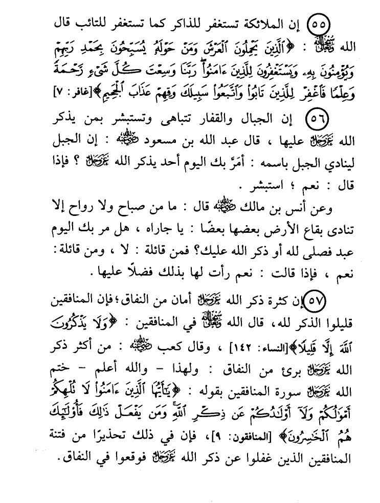 (57) - كثرة ذكر الله - عز وجل - أمان من النفاق؛ فإن المنافقين قليلوا الذكر لله، قال الله - سبحانه وتعالى - في المنافقين: {وَلَا يَذْكُرُونَ اللَّهَ إِلَّا قَلِيلًا} [النساء: 142]، وقال كعب - رضي الله عنه -: من أكثر ذكر الله - عز وجل - برئ من النفاق: ولهذا - والله أعلم - ختم الله - عز وجل - سورة المنافقين بقوله: {يَاأَيُّهَا الَّذِينَ آمَنُوا لَا تُلْهِكُمْ أَمْوَالُكُمْ وَلَا أَوْلَادُكُمْ عَنْ ذِكْرِ اللَّهِ وَمَنْ يَفْعَلْ ذَلِكَ فَأُولَئِكَ هُمُ الْخَاسِرُونَ} [المنافقون: 9]، فإن في ذلك تحذيرًا من فتنة المنافقين الذين غفلوا عن ذكر الله - عز وجل - فوقعوا في النفاق.