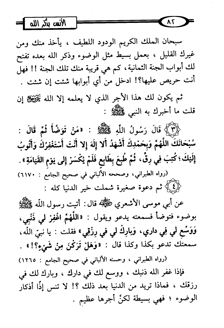 (3) قَالَ رَسُولُ اللهِ - صلى الله عليه وسلم -: "مَنْ تَوَضاَ ثُمَّ قَالَ: سُبْحَانَكَ اللهُم وَبِحَمْدكَ أَشهَدُ أَلا إِلَهَ إِلا أَنْتَ أَسْتَغْفِرُكَ وَأتوبُ إِلَيكَ، كُتِبَ في رِق، ثُم طُبعَ بِطَابع فَلَم يُكْسَرْ إِلى يَوْمِ القَيَامَةِ".