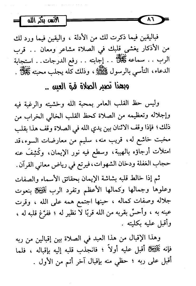 وليس حظ القلب العامر بمحبة الله وخشيته والرغبة فيه واجلاله وتعظيمه من الصلاة كحظ القلب الخالي الخراب من ذلك، فإذا وقف الاثنان بين يدي الله في الصلاة وقف هذا بقلب مخبت خاشع له، قريب منه، سليم من معارضات السوء، قد امتلأت أرجاؤه بالهيبة، وسطع فيه نور الإيمان" وكُشِفَ عنه حجاب الغفلة ودخان الشهوات، فيرتع في رياض معاني القرآن.
