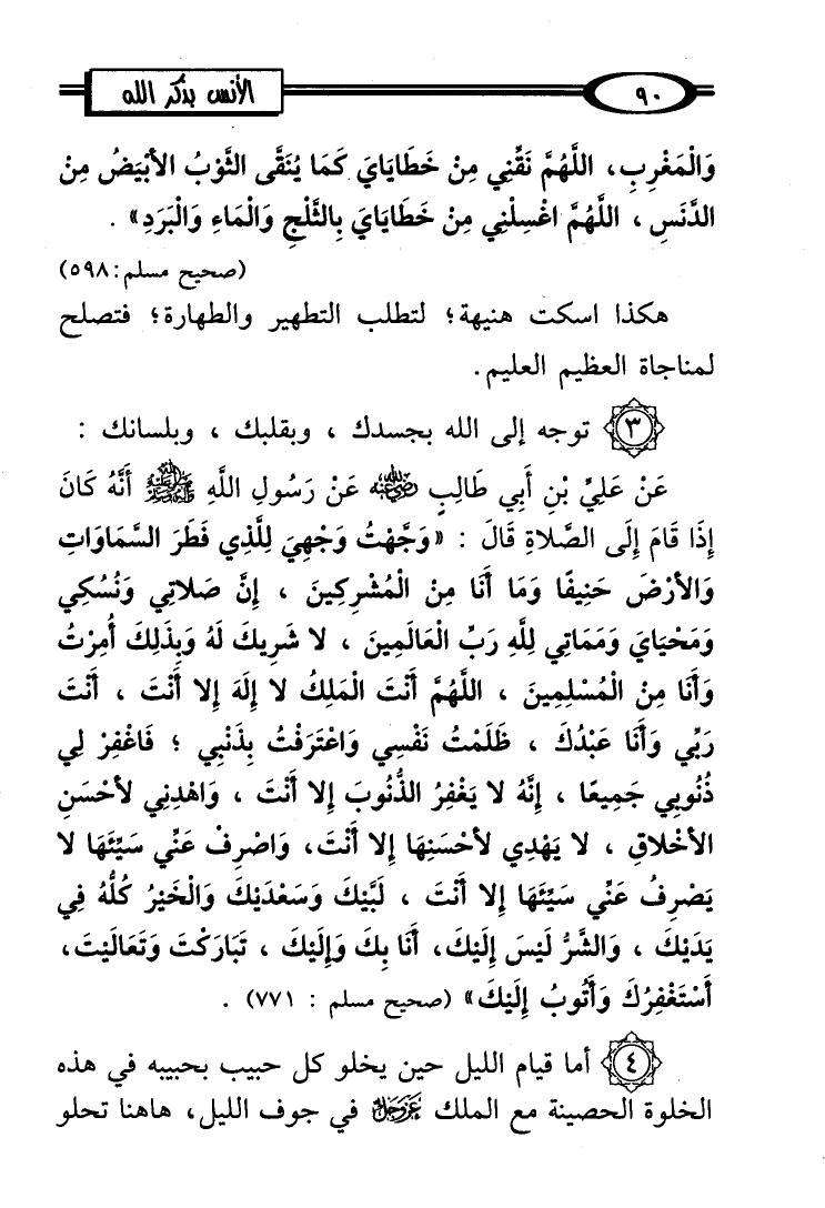 (3) توجه إلى الله بجسدك، وبقلبك، وبلسانك: عَنْ عَلى بْنِ أَبِي طَالِب - رضي الله عنه عَنْ رَسُولِ اللهِ - صلى الله عليه وسلم - أَنَّهُ كَانَ إِذَا قَامَ إِلَى الصَّلاةِ قَالَ:"وَجَّهْتُ وَجهي لِلَّذِي فَطَرَ السَّمَاوَاتِ وَالأرْضَ حَنِيفَا وَمَا أنا من الْمُشْرِكِينَ، إِن صَلاِتي وَنُسُكِي وَمَحْيَايَ وَمَمَاتِي لِلَّهِ رَب الْعَالَمِينَ، لا شَرِيكَ لَهُ وَبذلِكَ أُمِرْتُ وَأنا من الْمُسْلِمِينَ، اللهُم أَنتَ الْمَلِكُ لا إِلَهَ إِلا أنْتَ، أَنتَ ربي وَأَنا عَبْدُكَ، ظَلَمْتُ نَفْسِي وَاعْتَرَفتُ بِذنْبِي؟ فَاغْفِز لي ذُنُوبِي جَمِيعًا، إنهُ لا يَغْفِرُ الذُنُوبَ إِلا أَنْتَ، وَاهْدنِي لأحْسَنِ الأخْلاقِ، لا يَهْدِي لأحْسَنِهَا إِلا أَنْتَ، وَاصْرِف عَني سَيئَهَا لا يَصْرِفُ عَنِّي سَيِّئَهَا إِلا أَنتَ، لَبَّيكَ وَسَعْديْكَ وَالْخَيرُ كلُّهُ في يَدَيْكَ، وَالشَرُّ لَيسَ إِلَيكَ، أنا بِكَ وَإِلَيكَ، تَبَارَكتَ وَتَعَالَيتَ، أَسْتَغْفِرُكَ وَأتُوبُ إِلَيكَ" (صحيح مسلم: 771).