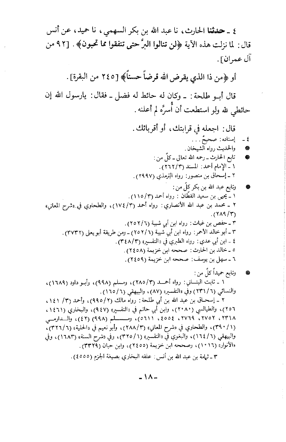 4 - حَدَّثَنَا الْحَارِثُ، نا عَبْدُ اللَّهِ بْنُ بَكْرٍ السَّهْمِيُّ، نا حُمَيْدٌ، عَنْ أَنَسٍ، قَالَ: لَمَّا نَزَلَتْ هَذِهِ الْآيَةُ {لَنْ تَنَالُوا الْبِرَّ حَتَّى تُنْفِقُوا مِمَّا تُحِبُّونَ} [آل عمران: 92] أَوْ {مَنْ ذَا الَّذِي يُقْرِضُ اللَّهَ قَرْضًا حَسَنًا} [البقرة: 245] قَالَ أَبُو طَلْحَةَ - وَكَانَ لهُ حَائِطٌ لَهُ فَضْلٌ - فَقَالَ: " §يَا رَسُولَ اللَّهِ إن حَائِطِي لِلَّهِ وَلَوِ اسْتَطَعْتُ أَنْ أُسِرَّهُ لَمْ أُعْلِنْهُ قَالَ: اجْعَلْهُ فِي قَرَابَتِكَ أَوْ أَقْرِبَائِكَ "
