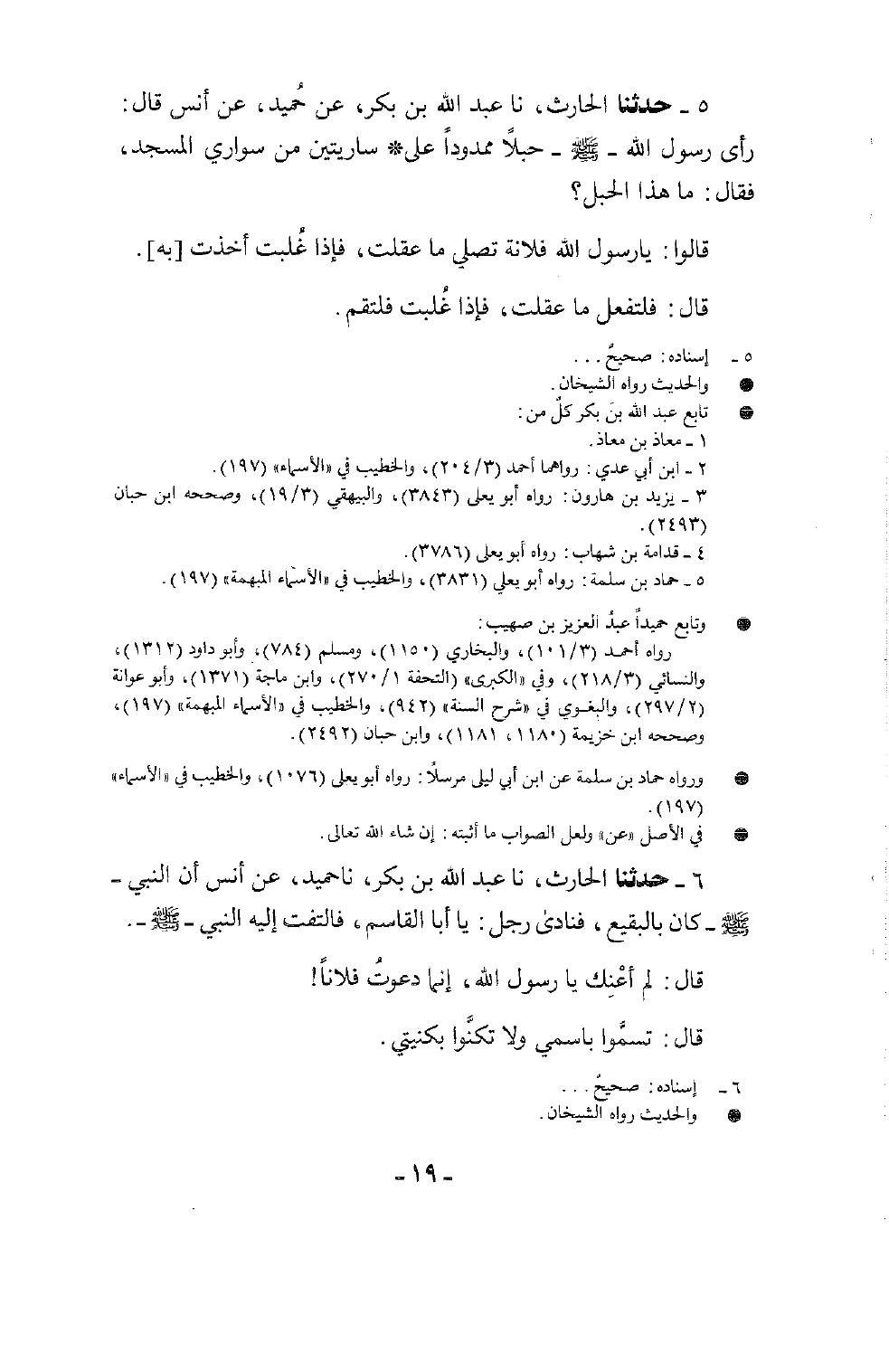 6 - حَدَّثَنَا الْحَارِثُ، نا عَبْدُ اللَّهِ بْنُ بَكْرٍ، نا حُمَيْدٌ، عَنْ أَنَسٍ، أَنَّ النَّبِيَّ صَلَّى اللَّهُ عَلَيْهِ وَسَلَّمَ كَانَ بِالْبَقِيعِ فَنَادَى رَجُلٌ: يَا أَبَا الْقَاسِمِ فَالْتَفَتَ إِلَيْهِ النَّبِيُّ صَلَّى اللَّهُ عَلَيْهِ وَسَلَّمَ. قَالَ: لَمْ أَعْنِكَ يَا رَسُولَ اللَّهِ إِنَّمَا دَعَوْتُ فُلَانًا. قَالَ: «§تَسَمَّوْا بِاسْمِي وَلَا تَكَنَّوْا بِكُنْيَتِي»