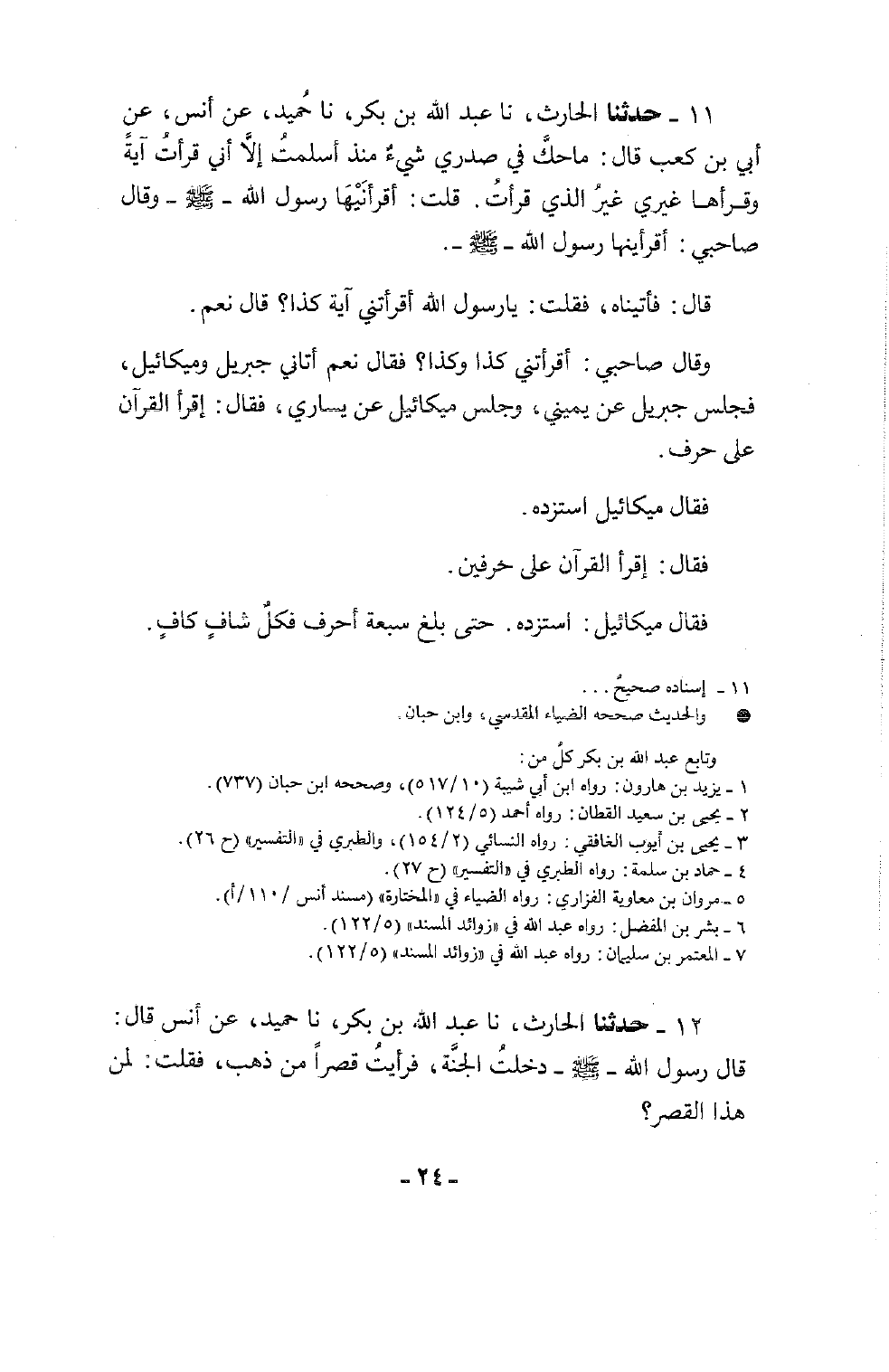 11 - حَدَّثَنَا الْحَارِثُ، نا عَبْدُ اللَّهِ بْنُ بَكْرٍ، نا حُمَيْدٌ، عَنْ أَنَسٍ، عَنْ أُبَيِّ بْنِ كَعْبٍ، قَالَ: مَا حَكَّ فِي صَدْرِي شَيْءٌ مُنْذُ أَسْلَمْتُ إِلَّا أَنِّي قَرَأْتُ آيَةً وَقَرَأَهَا غَيْرِي غَيْرَ الَّذِي قَرَأْتُ قُلْتُ: أَقْرَأَنِيهَا رَسُولُ اللَّهِ صَلَّى اللَّهُ عَلَيْهِ وَسَلَّمَ، وَقَالَ صَاحِبِي: أَقْرَأَنِيهَا رَسُولُ اللَّهِ صَلَّى اللَّهُ عَلَيْهِ وَسَلَّمَ قَالَ: فَأَتَيْنَاهُ فَقُلْتُ: يَا رَسُولَ اللَّهِ أَقْرَأْتَنِي آيَةَ كَذَا قَالَ: «نَعَمْ» ، وَقَالَ صَاحِبِي: أَقْرَأْتَنِي كَذَا وَكَذَا؟ فَقَالَ: " نَعَمْ أَتَانِي جِبْرِيلُ وَمِيكَائِيلُ فَجَلَسَ جِبْرِيلُ عَنْ يَمِينِي وَجَلَسَ مِيكَائِيلُ عَنْ يَسَارِي، فَقَالَ: §اقْرَأِ الْقُرْآنَ عَلَى حَرْفٍ فَقَالَ مِيكَائِيلُ: اسْتَزِدْهُ فَقَالَ: اقْرَأِ الْقُرْآنَ عَلَى حَرْفَيْنِ فَقَالَ مِيكَائِيلُ: اسْتَزِدْهُ حَتَّى بَلَغَ سَبْعَةَ أَحْرُفٍ فَكُلٌّ شَافٍ كَافٍ "