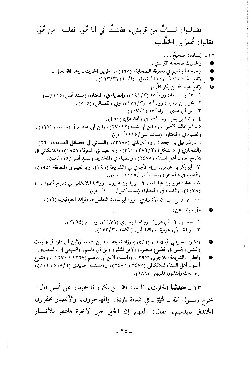 13 - حَدَّثَنَا الْحَارِثُ، نا عَبْدُ اللَّهِ بْنُ بَكْرٍ، نا حُمَيْدٌ، عَنْ أَنَسٍ، قَالَ: خَرَجَ رَسُولُ اللَّهِ صَلَّى اللَّهُ عَلَيْهِ وَسَلَّمَ فِي غَدَاةٍ بَارِدَةٍ وَالْمُهَاجِرُونَ وَالْأَنْصَارُ يَحْفِرُونَ الْخَنْدَقَ بِأَيْدِيهِمْ، فَقَالَ: «اللَّهُمَّ إِنَّ §الْخَيْرَ خَيْرُ الْآخِرَةِ فَاغْفِرْ لِلْأَنْصَارِ -[26]- وَالْمُهَاجِرَةِ» فَأَجَابُوهُ: