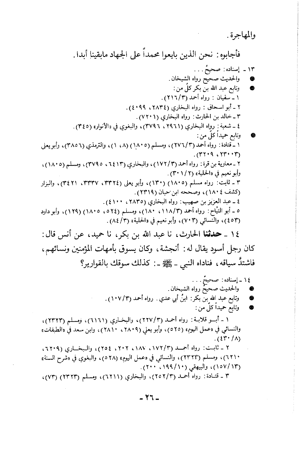 14 - حَدَّثَنَا الْحَارِثُ، نا عَبْدُ اللَّهِ بْنُ بَكْرٍ، نا حُمَيْدٌ، عَنْ أَنَسٍ، قَالَ: كَانَ رَجُلٌ أَسْوَدُ يُقَالُ لَهُ: أَنْجَشَةُ وَكَانَ يَسُوقُ بِأُمَّهَاتِ الْمُؤْمِنِينَ وَنِسَائِهِمْ فَاشْتَدَّ سِيَاقُهُ، فَنَادَاهُ النَّبِيُّ صَلَّى اللَّهُ عَلَيْهِ وَسَلَّمَ: «§كَذَلِكَ سَوْقُكَ بِالْقَوَارِيرِ؟»
