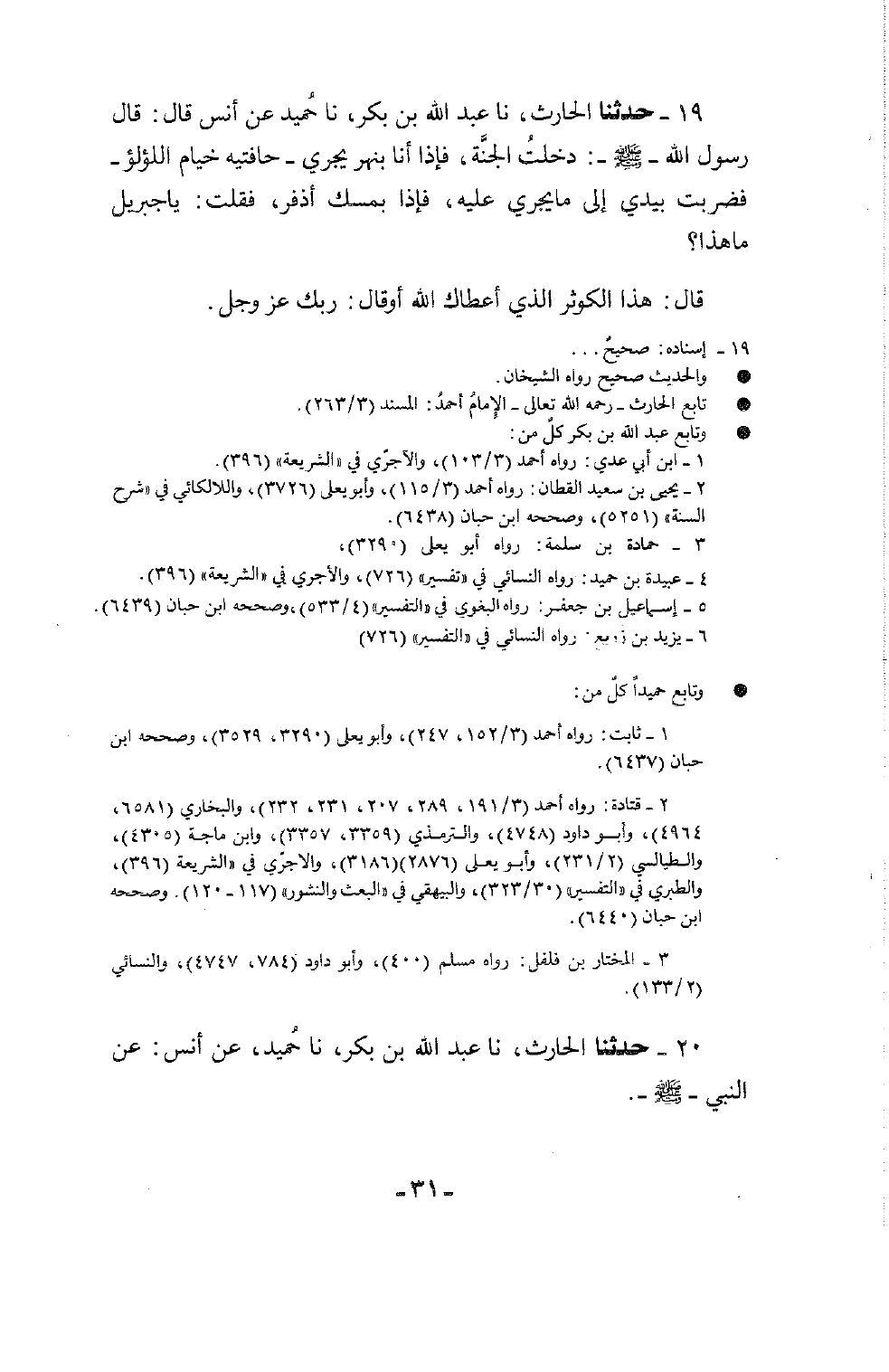 19 - حَدَّثَنَا الْحَارِثُ، نا عَبْدُ اللَّهِ بْنُ بَكْرٍ، نا حُمَيْدٌ، عَنْ أَنَسٍ، قَالَ: قَالَ رَسُولُ اللَّهِ صَلَّى اللَّهُ عَلَيْهِ وَسَلَّمَ: " §دَخَلْتُ الْجَنَّةَ فَإِذَا أَنَا بِنَهَرٍ يَجْرِي - حَافَتَيْهِ خِيَامُ اللُّؤْلُؤِ - فَضَرَبْتُ بِيَدِي إِلَى مَا يَجْرِي عَلَيْهِ فَإِذَا بِمِسْكٍ أَذْفَرَ فَقُلْتُ: يَا جِبْرِيلُ مَا هَذَا؟ قَالَ: هَذَا الْكَوْثَرُ الَّذِي أَعْطَاكَ اللَّهُ أَوْ قَالَ: رَبُّكَ عَزَّ وَجَلَّ "