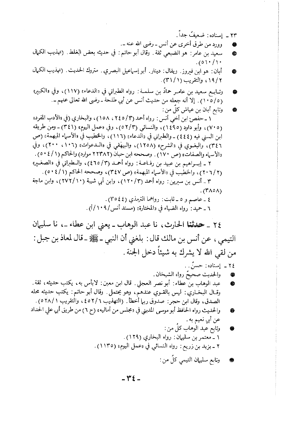 24 - حَدَّثَنَا الْحَارِثُ، نا عَبْدُ الْوَهَّابِ يَعْنِي ابْنَ عَطَاءٍ، نا سُلَيْمَانُ التَّيْمِيُّ، عَنْ أَنَسِ بْنِ مَالِكٍ، قَالَ: بَلَغَنِي أَنَّ النَّبِيَّ صَلَّى اللَّهُ عَلَيْهِ وَسَلَّمَ قَالَ لِمُعَاذِ بْنِ جَبَلٍ: «§مَنْ لَقِيَ اللَّهَ لَا يُشْرِكُ بِهِ شَيْئًا دَخَلَ الْجَنَّةَ»