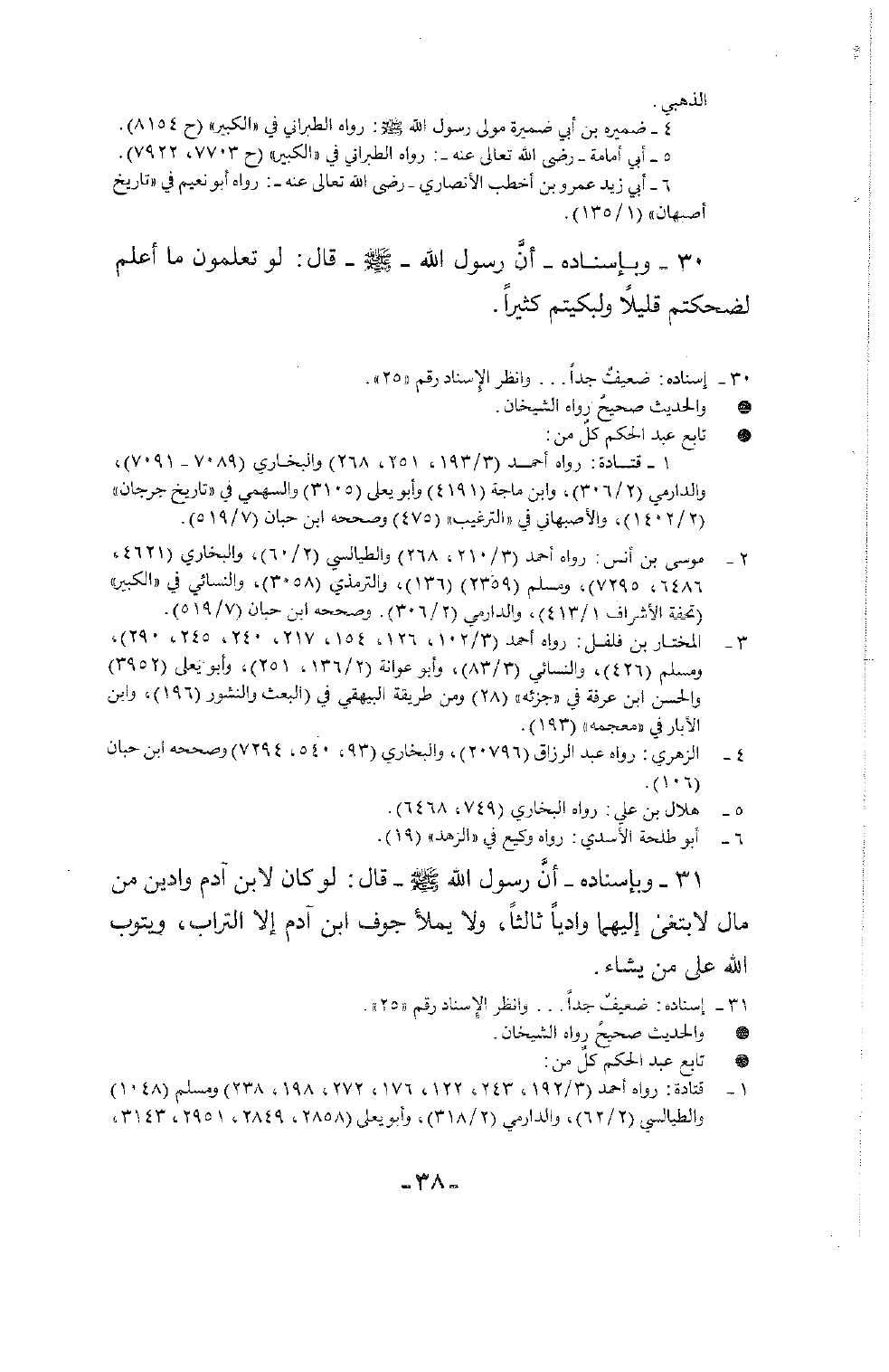 31 - وَبِإِسْنَادِهِ أَنَّ رَسُولَ اللَّهِ صَلَّى اللَّهُ عَلَيْهِ وَسَلَّمَ قَالَ: «§لَوْ كَانَ لِابْنِ آدَمَ وَادِيَيْنِ مِنْ مَالٍ لَابْتَغَى إِلَيْهِمَا وَادِيًا ثَالِثًا وَلَا يَمْلَأُ جَوْفَ ابْنِ آدَمَ إِلَّا التُّرَابُ وَيَتُوبُ اللَّهُ عَلَى مَنْ يَشَاءُ»