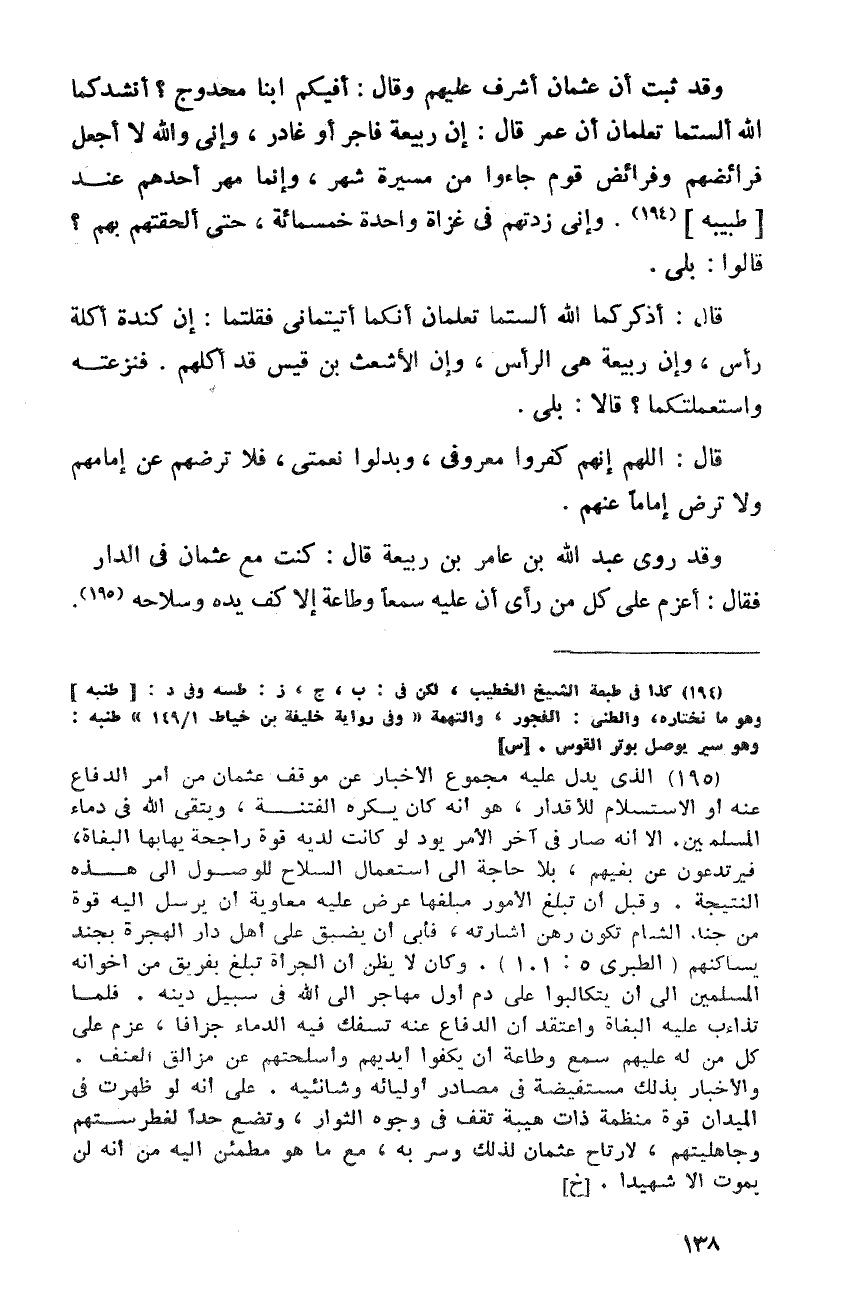 وقد ثبت أن عثمان أشرف عليهم وقال: أفيكم ابنا محدوج؟ أنشدكما الله ألتسما تعلمان أن عمر قال: إن ربيعة فاجر أو غادر، وإني والله لا أجعل فرائضهم وفرائض قوم جاءوا من مسيرة شهر، وإنما مهر أحدهم عند [طبيبه] 194. وإني زدتهم في غزاة واحدة خمسمائة، حتى ألحقتهم بهم؟ قالوا: بلى.