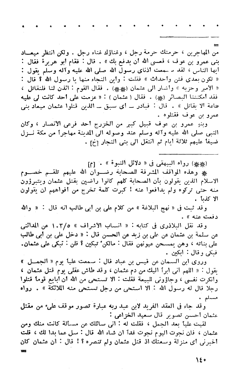 = من المهاجرين، حرمتك حرمة رجل، وغناؤك غناء رجل. ولكن انتظر ميعاد بني عمرو بن عوف، فعسى الله أن يدفع بك". قال: فقام أبو هريرة فقال: "أيها الناس، لقد سمعت أذناي رسول الله صلى الله عليه وآله وسلم يقول: "تكون بعدي فتن وأحداث" فقلت: وأين النجاء منها يا رسول الله؟ قال: "الأمير وحزبه" وأشار إلى عثمان**. فقال القوم: ائذن لنا فلنقاتل، فقد أمكنتنا البصائر. فقال عثمان: "عزمت على أحد كانت لي عليه طاعة ألا يقاتل". قال: فبادر -أي سبق- الذين قتلوا عثمان ميعاد بني عمرو بن عوف فقتلوه.
