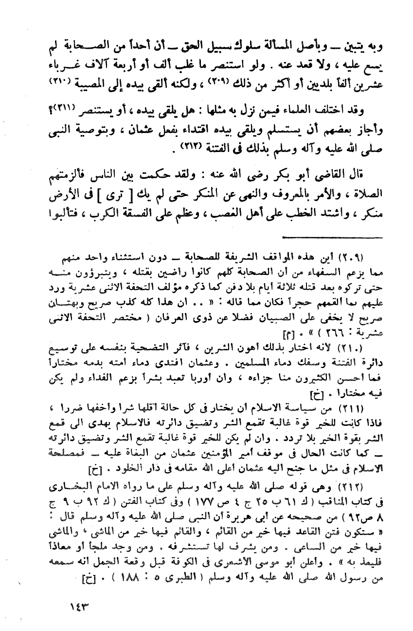 212 وهي قوله صلى الله عليه وآله وسلم على ما رواه الإمام البخاري في كتاب المناقب ك61 ب 25 ج 4، صـ 177، وفي كتاب الفتن ك 92 ب9، ج 8، صـ 92 من صحيحه عن أبي هريرة أن النبي صلى الله عليه وآله وسلم قال: "ستكون فتن القاعد فيها خير من القائم، والقائم، فيها خير من الماشي، والماشي فيها خير من الساعي، ومن يشرف لها تستشرفه، ومن وجد ملجأ أو معاذًا فليعذ به"، وأعلن أبو موسى الأشعري في الكوفة قبل وقعة الجمل أنه سمعه من رسول الله صلى الله عليه وآله وسلم "الطبري: 188: 5". "خ".