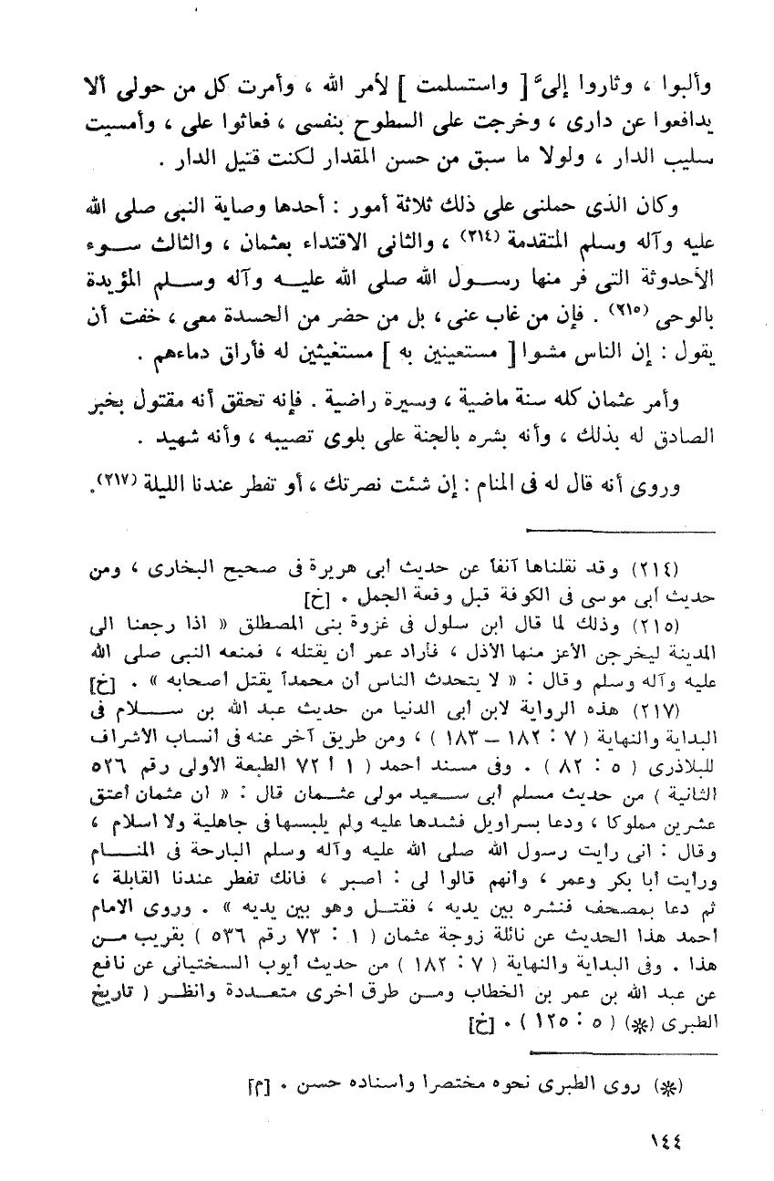 217 هذه الرواية لابن أبي الدنيا من حديث عبد الله بن سلام في البداية والنهاية: 182:7-183، ومن طريق آخر عنه في أنساب الأشراف للبلاذري: 82:5. وفي مسند أحمد: "72/1 الطبعة الأولى رقم 526 الثانية" من حديث مسلم أبي سعيد مولى عثمان قال: إن عثمان أعتق عشرين مملوكًا، ودعا بسراويل فشدها عليه ولم يلبسها في جاهلية ولا إسلام، وقال: "إني رأيت رسول الله صلى الله عليه وآله وسلم البارحة في المنام ورأيت أبا بكر وعمر، وأنهم قالوا لي: اصبر، فإنك تفطر عندنا القابلة، ثم دعا بمصحف فنشره بين يديه، فقتل وهو بين يديه". وروى الإمام أحمد هذا الحديث عن نائلة زوجة عثمان 73:1 رقم 536 بقريب من هذا. وفي البداية والنهاية 182:7 من حديث أيوب السختياني عن نافع عن عبد الله بن عمر بن الخطاب، ومن طرق أخرى متعددة، وانظر تاريخ الطبري*: 125:5."خ".