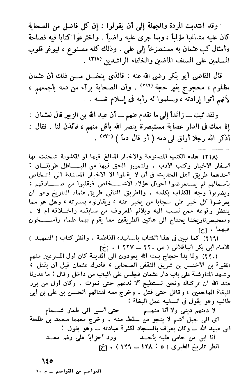 قال القاضي أبو بكر رضي الله عنه: فالذي ينخل من ذلك أن عثمان مظلوم، محجوج بغير حجة219. وأن الصحابة برآء من دمه بأجمعهم؛ لأنهم أتوا إرادته، وسلموا له رأيه في إسلام نفسه.