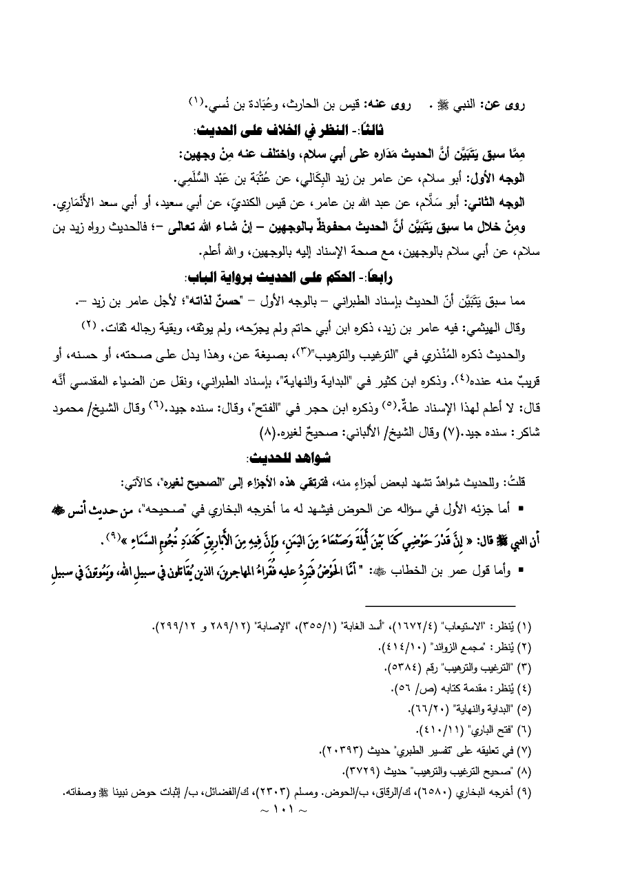 والحديث ذكره المُنْذري في "الترغيب والترهيب" (¬٣)، بصيغة عن، وهذا يدل على صحته، أو حسنه، أو قريبٌ منه عنده (¬٤). وذكره ابن كثير في "البداية والنهاية"، بإسناد الطبراني، ونقل عن الضياء المقدسي أنَّه قال: لا أعلم لهذا الإسناد علةٌ. (¬٥) وذكره ابن حجر في "الفتح"، وقال: سنده جيد. (¬٦) وقال الشيخ/ محمود شاكر: سنده جيد. (¬٧) وقال الشيخ/ الألباني: صحيحٌ لغيره. (¬٨)
