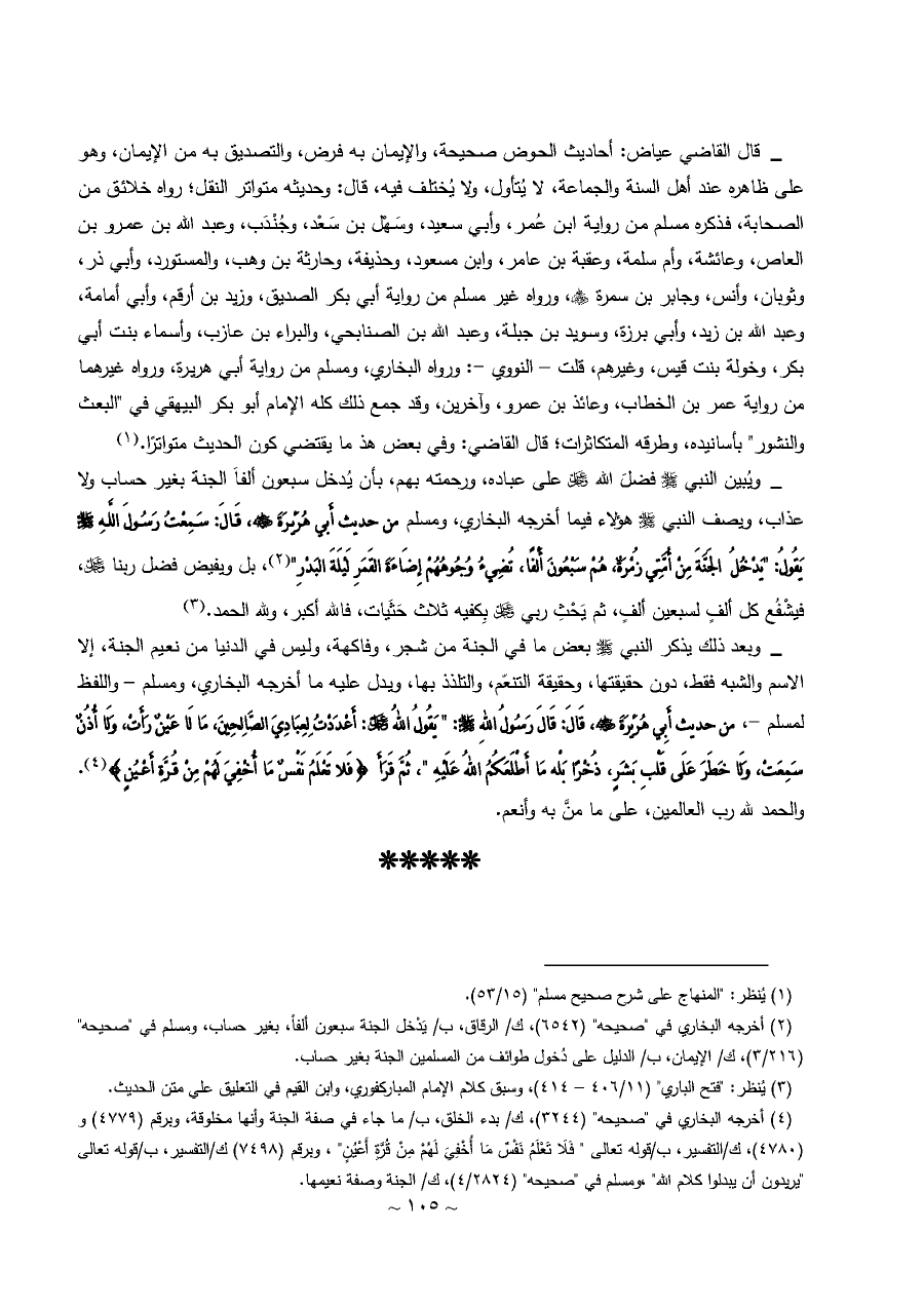 (¬٢) أخرجه البخاري في "صحيحه" (٦٥٤٢)، ك/ الرقاق، ب/ يَدْخل الجنة سبعون ألفاً، بغير حساب، ومسلم في "صحيحه" (٢١٦/ ٣)، ك/ الإيمان، ب/ الدليل على دُخول طوائف من المسلمين الجنة بغير حساب.