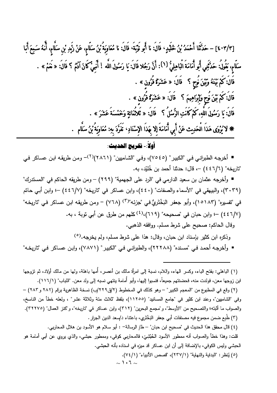 (¬١) الباهلي: بفتح الباء، وكسر الهاء، واللام، نسبة إلى امرأة مالك بن أعصر، أُمها باهلة، ولها من مالك أولاد، ثم تزوجها ابن زوجها معن، فولدت منه، فحضنتهم جميعاً، فنسبوا إليها، وأبو أُمامة ينتهي نسبه إلى ولد معن. "اللباب" (١/ ١١٦).